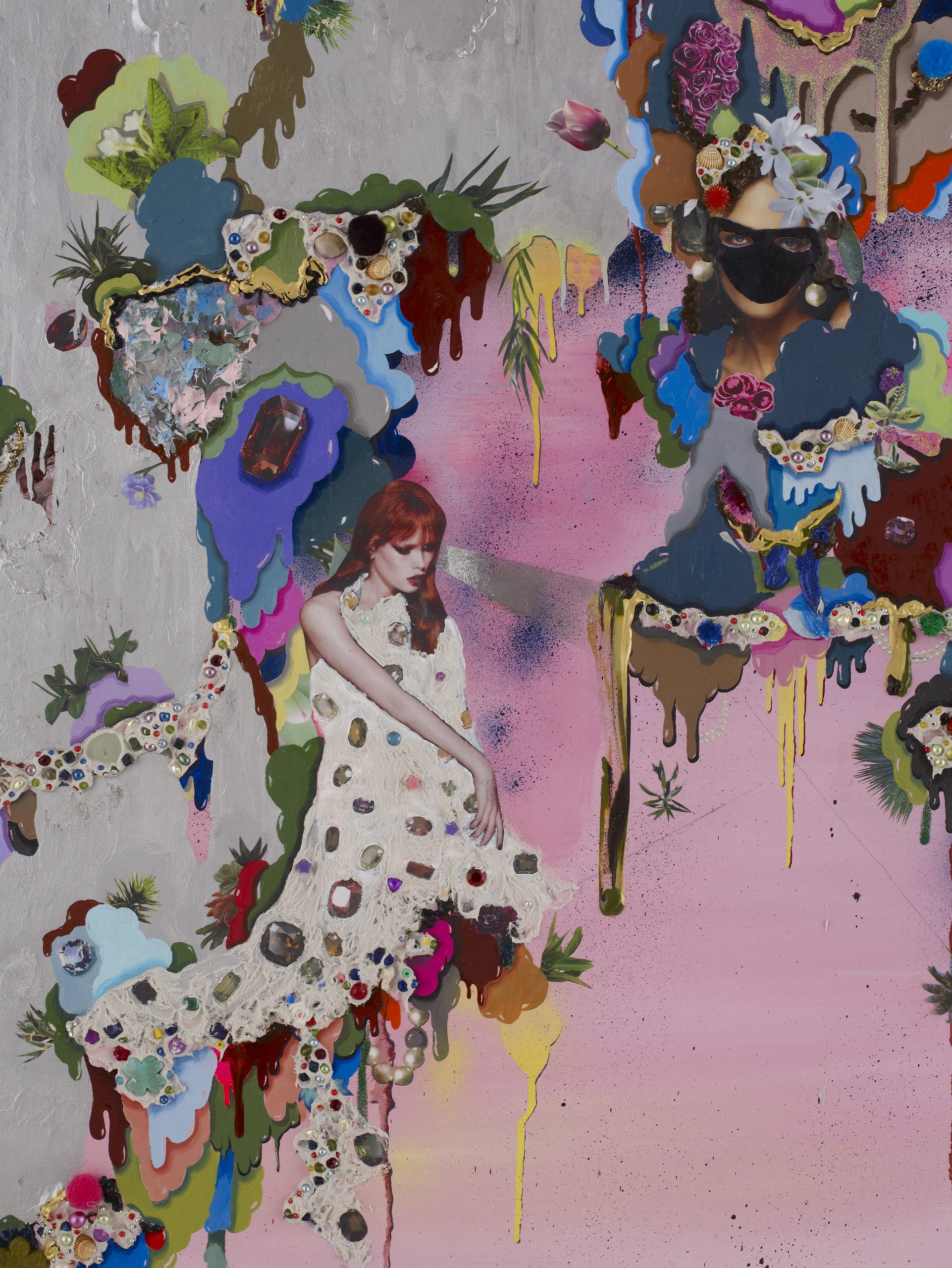 Alicia Paz’s paintings, collages and standing figures deal primarily with identity and the notion of a divided subject/author, and explore the mutability of subjectivity. In recent years, Paz has focused on the female figure: the Self is experienced and presented as multiple, paradoxical, and in flux. Inhabiting fantastical and exotic landscapes, Paz’s feminine subjects become fused and combined with organic life. Strange and unsettling visions of tree-women and monster-women also represent the fusion of the Subject with painting itself: she often depicts amphibian or plant-like figures “weeping” pigment, their limbs, hair, and various ornamental accoutrements mud-caked and dripping, as if extracted from a colourful, post-cognitive swamp.