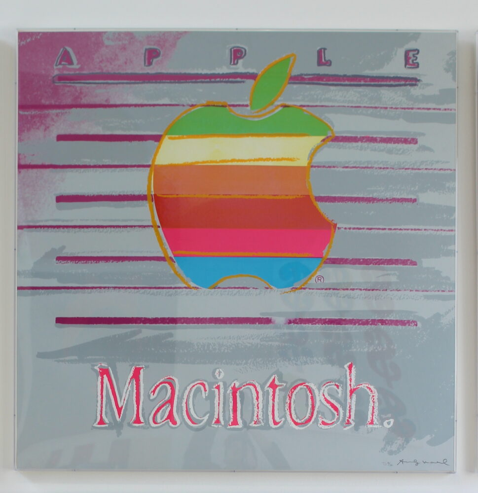 From his 1985 Ads Complete Portfolio, Apple 359 is a screenprint created by Andy Warhol that has appropriated the logo for Macintosh Computers. The logo, which is now as ubiquitous as the fruit itself, maintains the original design and rainbow color scheme, but Warhol adds his trademark sketched lines and vibrant hues to give the original design an unmistakably Warholian influence. He was commissioned by Del Yocam, the first COO of Apple, as a part of the company’s advertising campaign. The same year this print was created, Warhol encountered Steve Jobs (the founder of Apple) and wrote in his diary about the meeting: “he gave me a lesson on drawing with it. It only comes in black and white now, but they’ll soon make it in color… I felt so old and out of it with this whiz guy right there who’d helped invent it.”