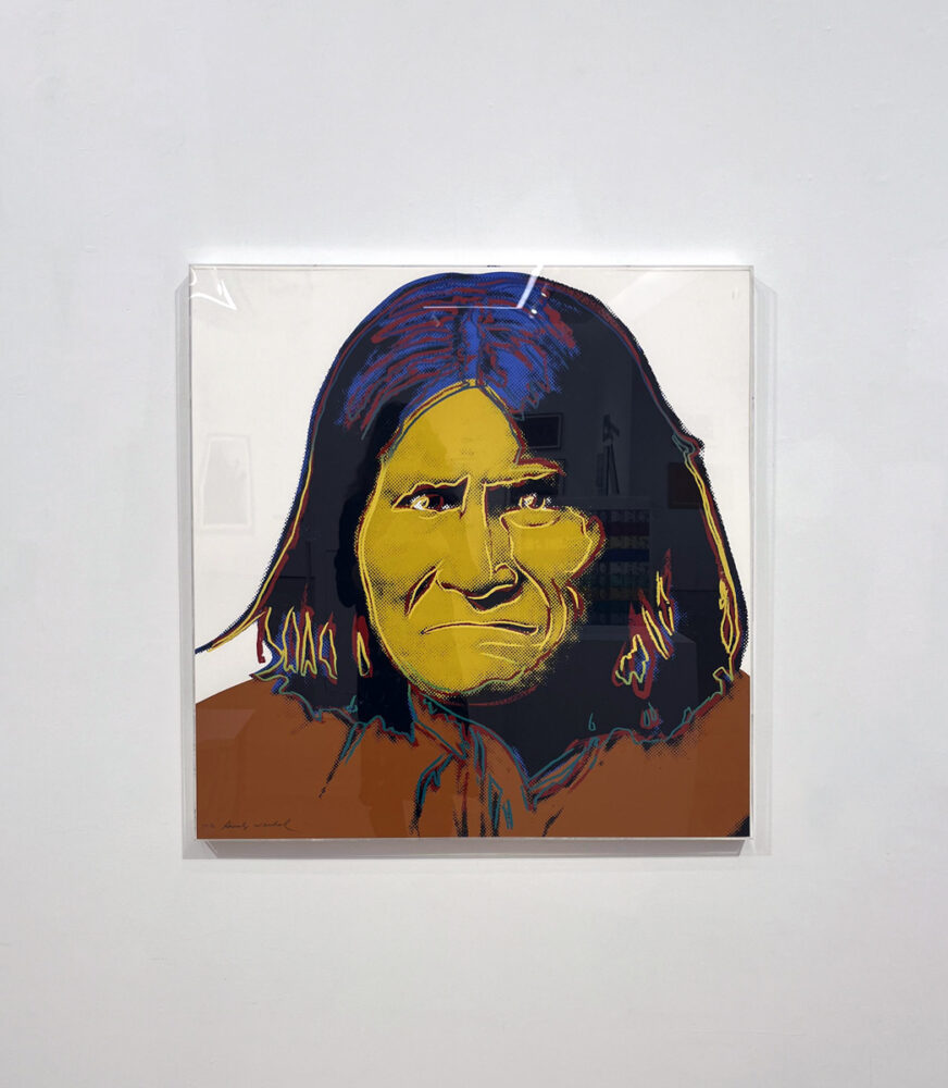 Geronimo 384 stands out within the portfolio for its solemnity and intensity. Warhol stripped away the irony often found in his celebrity portraits, instead emphasizing dignity and resistance. The bold palette contrasts with the stoic expression, symbolizing both heroism and struggle. Moreover, Warhol’s use of bright, artificial color highlights the tension between myth and truth, revealing how mass media shaped America’s collective memory of its frontier past.