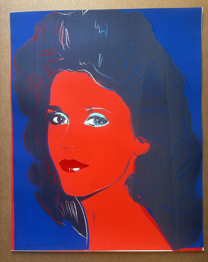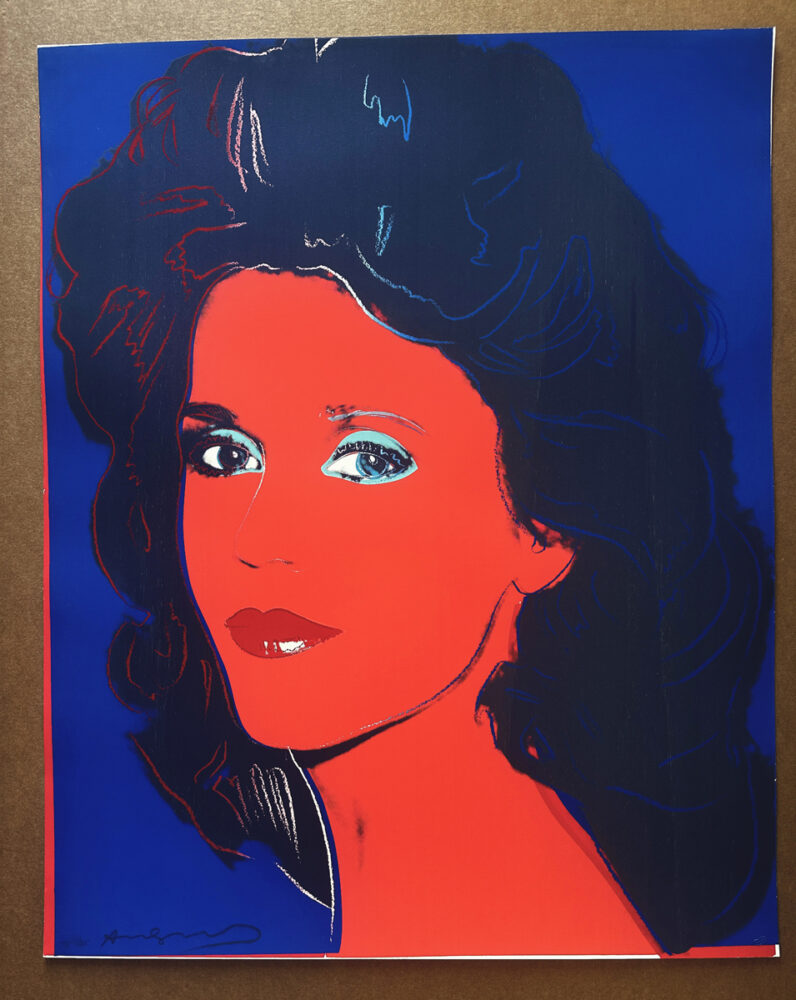 In addition, this rare variation highlights Warhol’s technical precision during the 1980s—a period that saw him return to the celebrity portrait with renewed sophistication. The red background radiates intensity, while the blue underpainting introduces a cool counterbalance. Consequently, the result is both intimate and theatrical, situating Fonda between the movie screen and the political stage. Her confident gaze and luminous expression suggest a woman equally at home in art, activism, and fame. Finally, through his mastery of silkscreen technique, Warhol elevates Fonda’s likeness into a timeless study of visibility and influence.