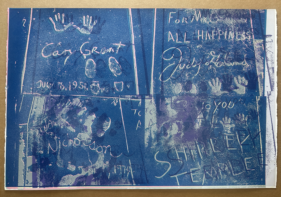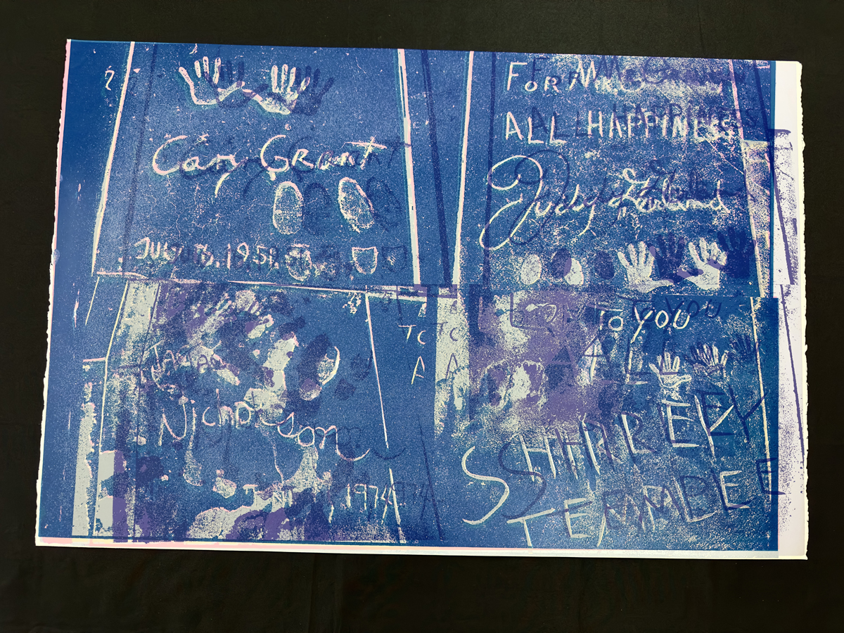 Sidewalk 304 translates an L.A. ritual—the celebrity handprints and signatures in on the Hollywood Walk of Fame—into Warhol’s Pop language. He isolates the famous squares and pares the scene down to names, hands, dates, and seams. As a result, the artwork reads like a collage of fame: Grant’s 1951 panel, Garland’s message “For Mr. Grauman, all happiness,” Nicholson’s mid-’70s inscription, and Temple’s child-star presence. Warhol turns these public dedications into a single image about memory and myth, where handwriting becomes portraiture and touch becomes icon.