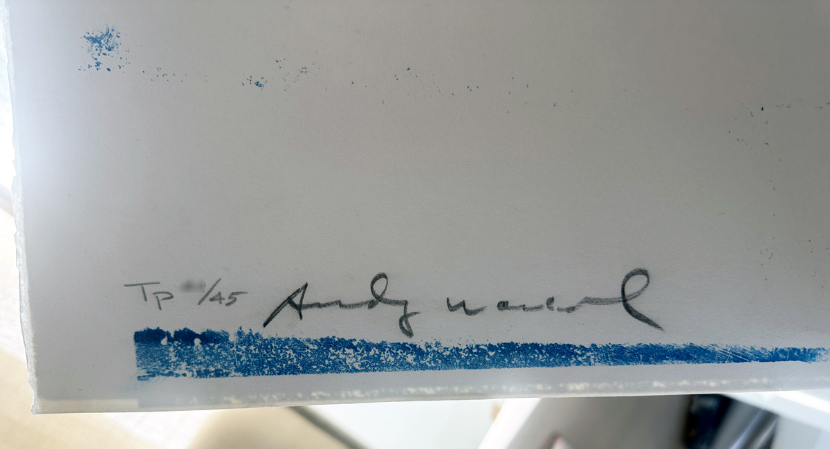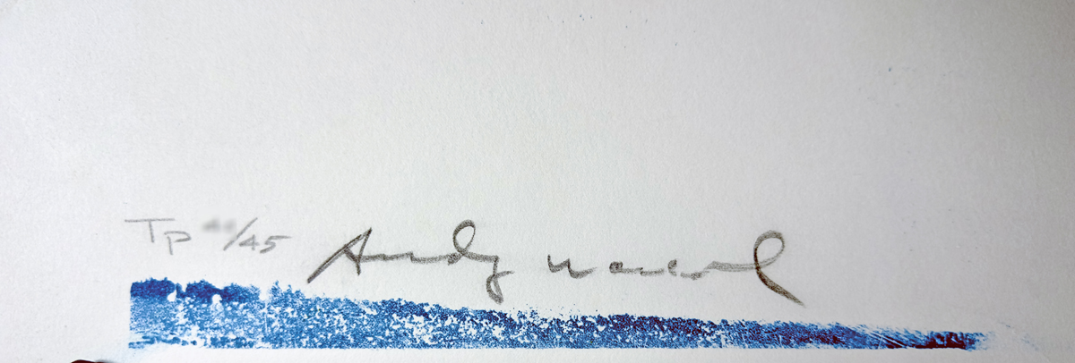 This impression is a trial proof (TP). In printmaking, a trial proof is pulled before the regular edition to test ink colors, paper, and registration. Warhol and the printer reviewed these tests, then adjusted screens and palette until the image achieved the desired look. Because of that process, a TP often shows variant color choices, layering, or surface effects not found in the numbered edition. It is usually marked “TP” and is considered outside, and rarer than, the standard run. Consequently, collectors prize trial proofs for the way they reveal the artist’s decisions and the evolution of the final print.