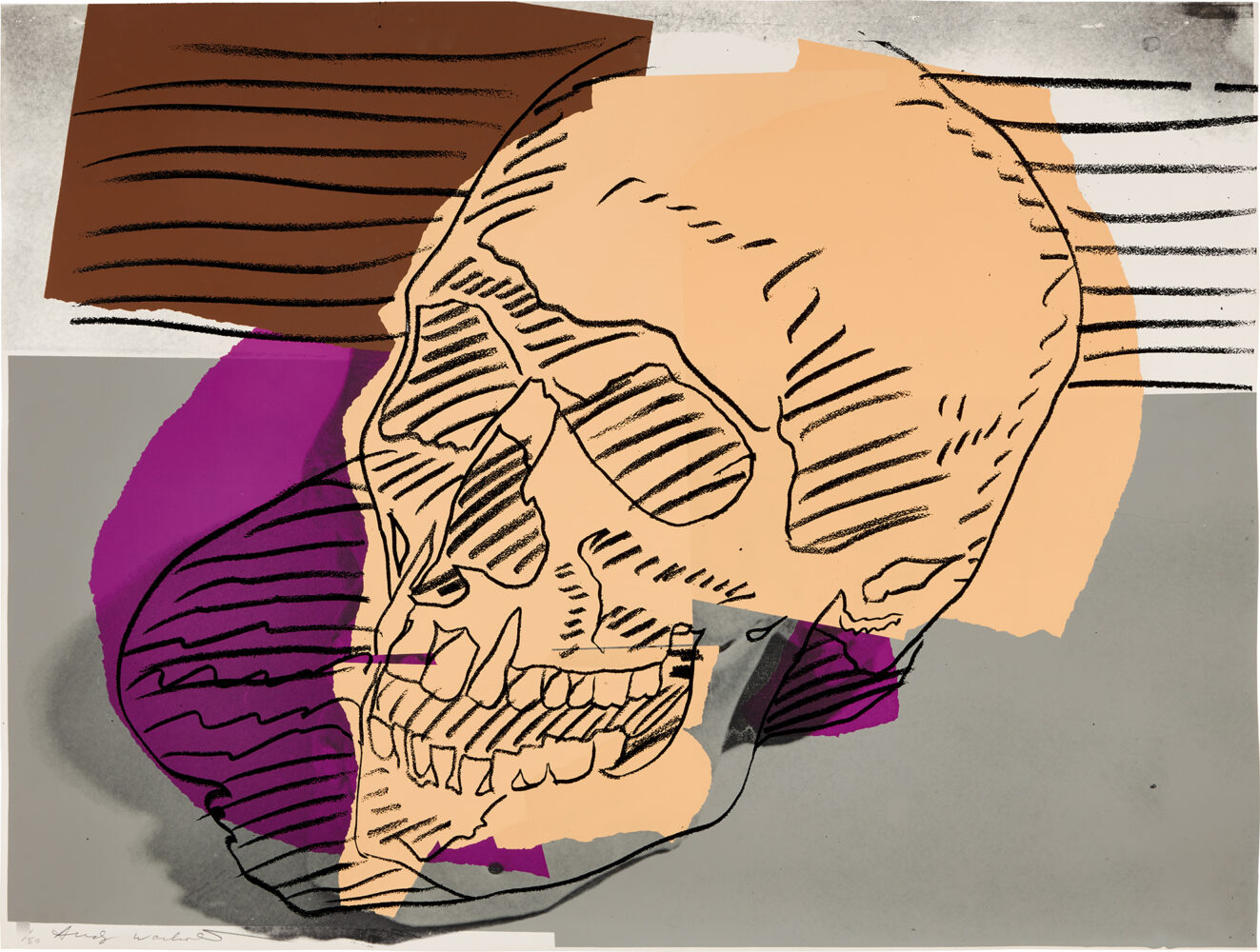 Skulls by Andy Warhol is a series of our silkscreen prints from 1976. The subject matter of this portfolio, appearing between 1975 works like Mick Jagger and later 1970s works like Hammer and Sickle and Grapes, represents an interesting shift in Warhol’s work. Besides exhibiting a propensity for still life artworks, the morbidity of the Skulls series points back to earlier works like Death and Disaster and Gun. Warhol’s interest in death and mortality was likely accelerated by his experience of being shot and critically wounded in 1968, an event which profoundly affected his life and art.