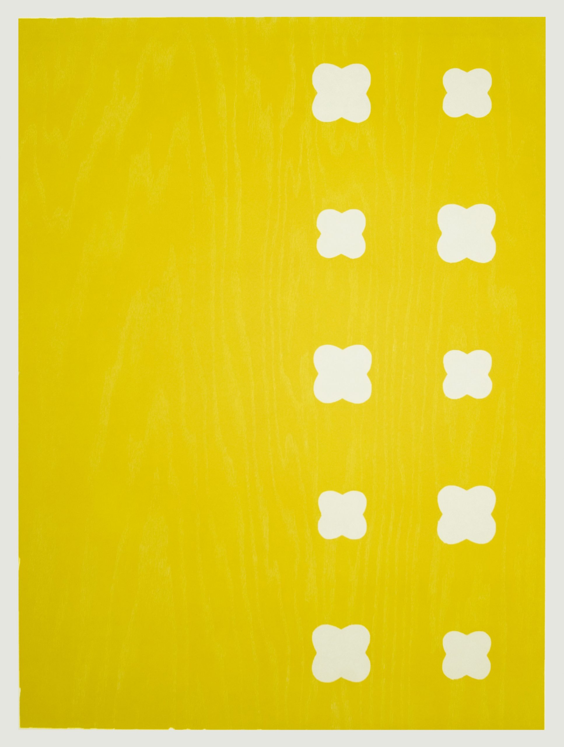 Ann Conner’s Brentwood Series of six woodcuts was created and published in 2010. These large woodcuts reference shapes that seem familiar and even banal. She arranged and carved them into plywood matrices which were printed using colors she selected to reference the architectural colors of Brentwood, California. As a suite, the woodcuts create a strong sense of harmony and singly the prints stand alone. Brentwood 3 is printed in a certain which may be seen on certain fast-food places in Brentwood and across the USA.