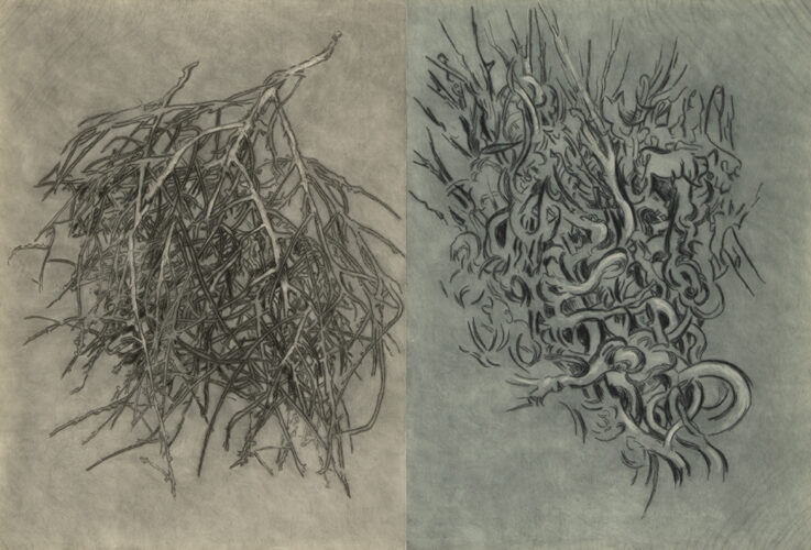 Annie Lapin’s paintings reside in a world of multiplicities; digital histories and analog mark making come together to form landscapes that abide neither to the rules of the virtual nor to the physical. Initiating each painting with generous pours of paint and liquid graphite, Lapin’s abstract marks become the armature around which pictorial space is built. Punched with trompe l’oeil forms, photographic blur, and references to the sublime imagery of Western landscape painting and photography, the polyvalent scenes conjure a sense of mystery and fervor.