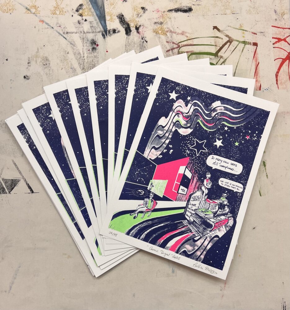 Medium: Hand drawn, hand pulled screen print on Fabriano 300gsm fine art paper, signed, numbered, and stamped by the artist.