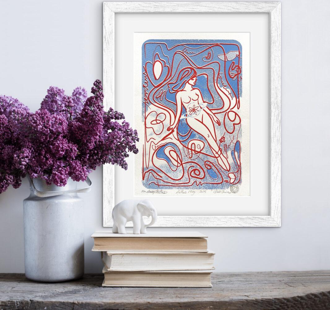 Arty-Fact: “Miss Univers” représente une figure féminine rayonnant dans son propre espace intérieur. Inspirée par l’arcane Le Monde du Tarot, l’œuvre évoque la complétude et la conscience du sacré intime. Ici, la femme incarne une présence entière, universelle, et pourtant ancrée dans le vécu sensible. Les lignes fluides qui l’entourent traduisent un mouvement énergétique entre corps, intuition et espace. Chaque impression réalisée à la main en sérigraphie possède de légères variations, rendant chaque tirage unique.