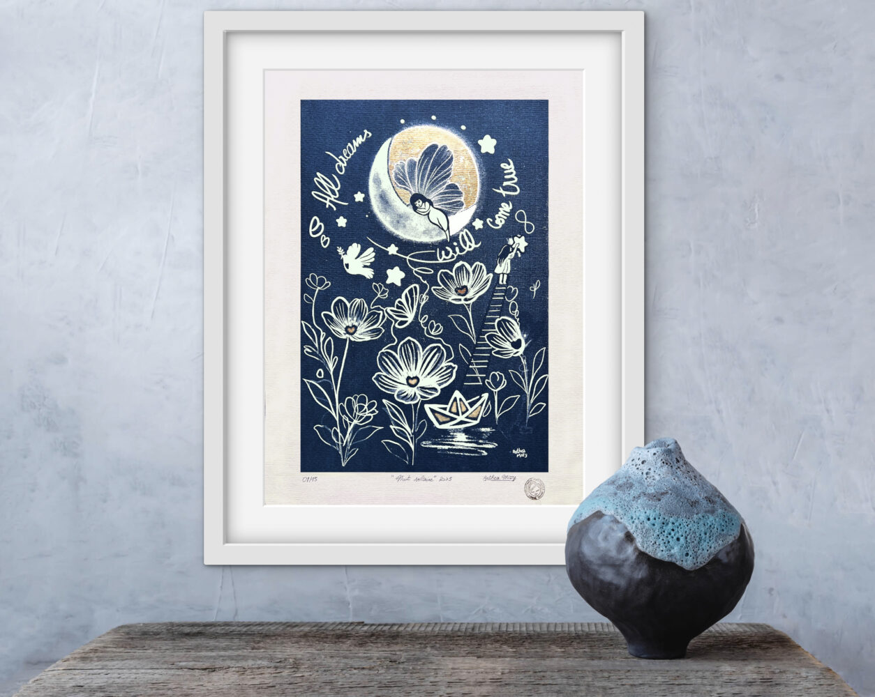 In daylight, the gold-leafed moon reflects a sunny, clean light that sharpens the contours of the flowers, the floating figure, and the inscription “all dreams will come true.” The overall impression is crisp, structured, and intentionally defined.