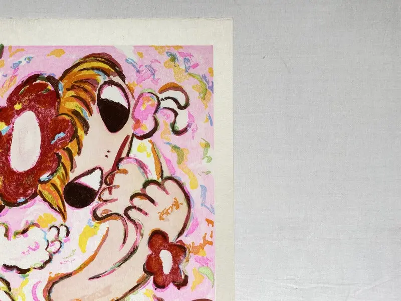 Ayako Rokkaku’s Untitled 1 (2020) merges traditional Japanese craftsmanship with her distinctly contemporary aesthetic. Produced in collaboration with The Adachi Institute of Woodcut Prints in Tokyo, this ukiyo-e style woodcut translates Rokkaku’s vivid, hand-painted imagery into a refined print medium. The artist’s expressive lines and colorful compositions retain their spontaneity through the delicate precision of woodcut printing. Limited to an edition of 120, each impression is hand-signed, dated, and numbered by Rokkaku and presented with its original case. This work stands as a testament to the artist’s ability to bridge modern creativity with centuries-old technique.