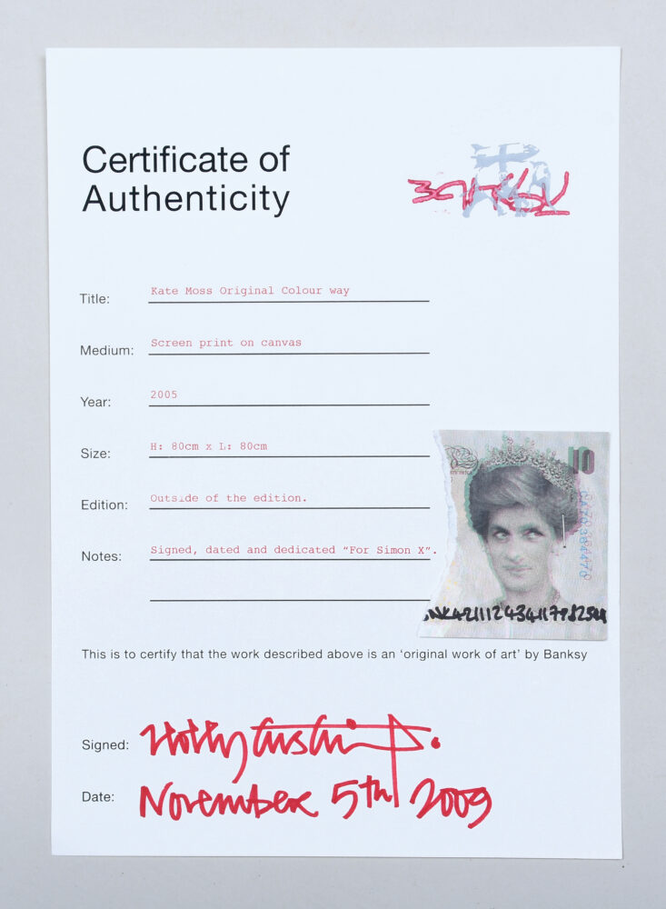 Inscribed by Banksy aside from the edition of 5, signed, dated and dedicated lower right “2005 For Simon x Banksy”, together with a certificate of authenticity from Pest Control. The recipient, Simon Durban, was an accountant for Banksy and a director for Pictures on Walls, Lazinc, Pest Control, Paranoid Pictures, and Gross Domestic Product, all companies associated with Banksy.