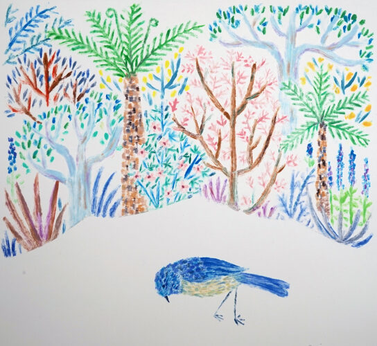The woodcut series entitled “On Earth as it is in Heaven” (“Wie im Himmel so auf Erden”) shows mathematician Omar Khayyam (1048-1131), who reformed the ancient Persian calendar by aligning it with the passage of the sun, as he studies the stars. Held in pinks and reds, each background has been painted individually. This choice of motifs reflects Behrang Karimi’s marked interest in mystical and philosophical texts, which include the medieval scripts of Benedictine healer and botanist Hildegard of Bingen as well as texts from the early Age of Enlightenment by friends and essayists Michel de Montaigne and Etienne de la Boétie. Texts and images alike are characterised by their hybrid nature, their fluid transition between observation and dream, premonition and knowing, the visible and the invisible, power and powerlessness.