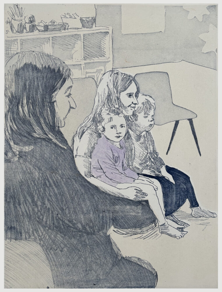 ‘Early Years’ brings my interest in nurseries as a subject for painting into the language of printmaking with my first set of etchings. Early Years is a term used to describe children’s developmental provision in the years before they start school. It’s a period in which young children learn about the world around them -how to feed and dress themselves, speak and understand language and build relationships with others. Each etching depicts a scene of nurture with a paired back palette of colours allowing me to enjoy the quality of line that etching offers. ‘Spoon Fed’ depicts my own daughter eating lunch as a 2 year old, ‘Comforted’ and ‘Prepared’ show children in the forest setting of the outdoor nursery both my children have attended, and in ‘Settled’ the little girl at the centre of the image looks back directly, interested in my presence there documenting these acts of care which are most often out of sight.