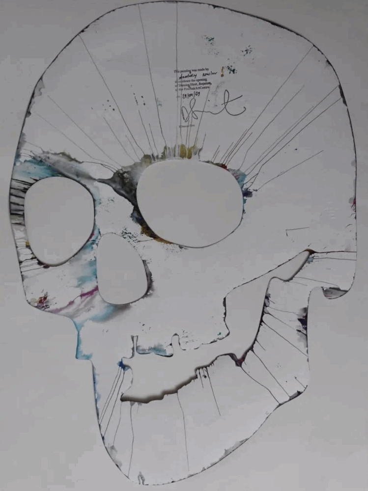 In this variation, Hirst introduces a skull motif—a central theme in his exploration of life, death, and memory. The intense, vibrant circular movement amplifies the tension between chromatic vitality and macabre symbolism. The result is a powerful, visually hypnotic work at the intersection of technical experimentation and existential reflection.