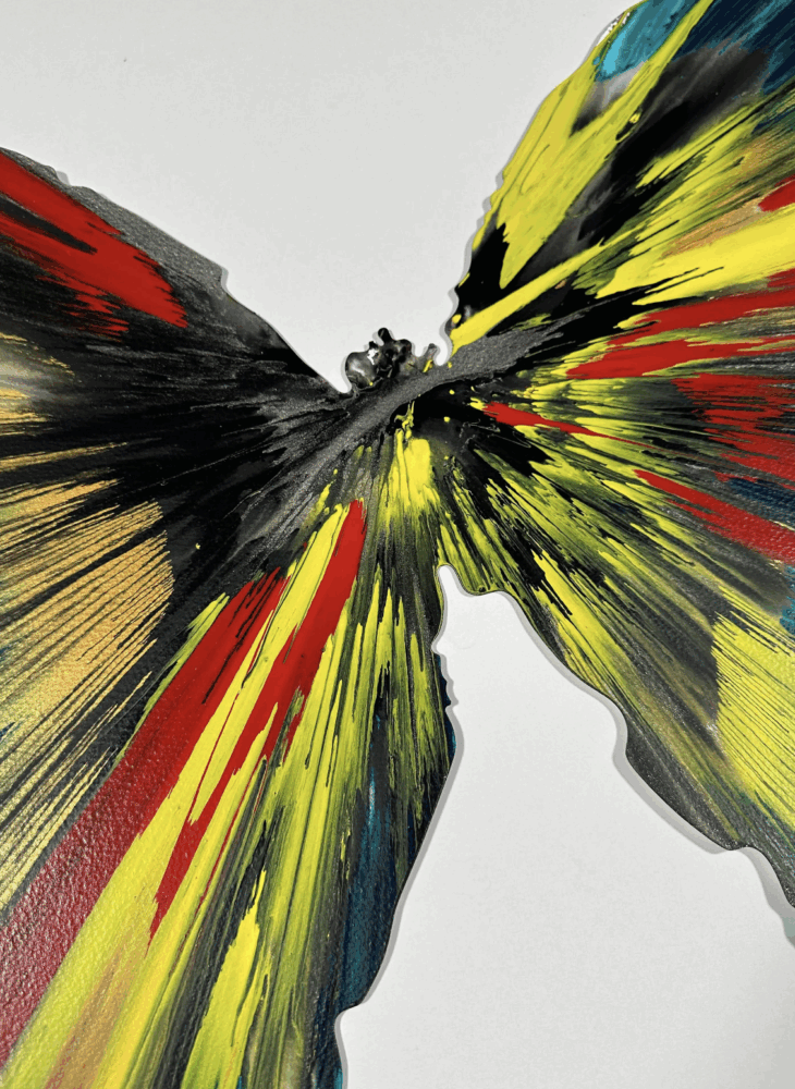 Description: Butterfly Spin Painting (2009) is a unique acrylic on paper by Damien Hirst, part of his celebrated Spin Painting series. The piece features a butterfly motif—a recurring symbol in Hirst’s work representing transformation and the fragility of life—set within a vibrant swirl of paint. This spontaneous and energetic creation reflects the artist’s fascination with movement, color, chance, and the ephemeral beauty of life. Signed on the back by the artist, it is carefully shipped from France.