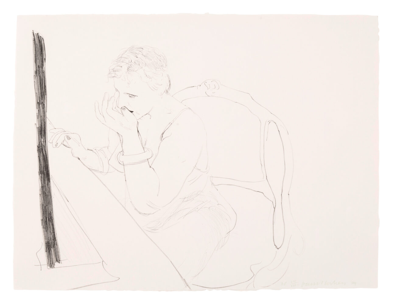 Note: Hockney and Celia Birtwell, a fashion designer, met in 1968 in Portobello Road. She soon began to appear in the artist’s work, but particularly in his prints. She sits for 30 portraits, which compose about a quarter of his total printed portrait oeuvre. Many of the Celia portraits recall those made by Matisse and Degas.