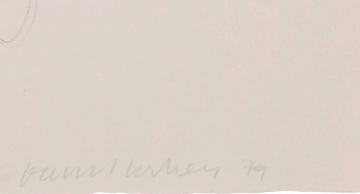 This original lithograph is hand signed in green pencil by the artist “Hockney” in the lower right margin. It is also dated “79” (1979) in pencil.