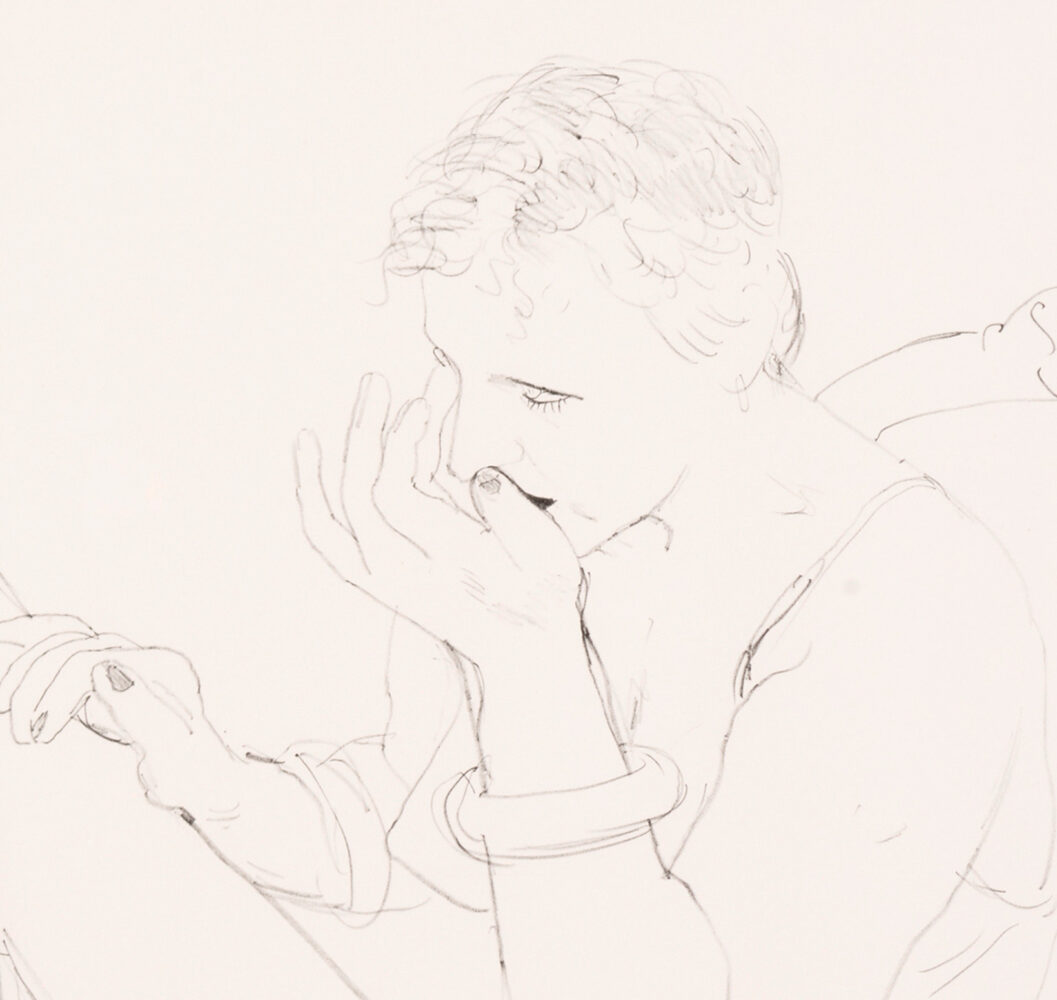 Celia Birtwell said: “We have always felt completely comfortable in each other’s company. We amused each other. I found posing for him to be a very intimate, and silent, affair…Before commencing we have a conversation about how he wants me to look. I could look left or right. He may say, ‘Move your arm.’ ‘Sit further back.’ ‘Look out of the window.’ then comes the moment when he suddenly says, ‘I like that.’ whilst he’s drawing me I can see the intensity, struggle and concentration on his face. The intensity is extraordinary. After an hour or so he’ll say, ‘do you want to take a break, luvvie?’ Sometimes I take a peek at the portrait, other times I prefer to wait until it’s finished. He always says he doesn’t appeal to vanity. Whatever my feelings are, they are always amazing.”