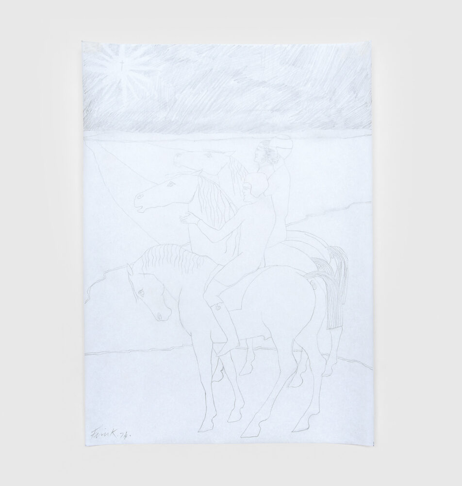 This drawing is in a similar style to a published etching in her illustrated version of Canterbury Tales, titled Arrival at Canterbury. The horse was a common theme throughout Frink’s work, be it drawing, print or sculpture. She owned horses and was a keen rider throughout her life.
