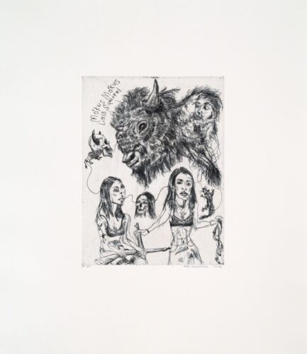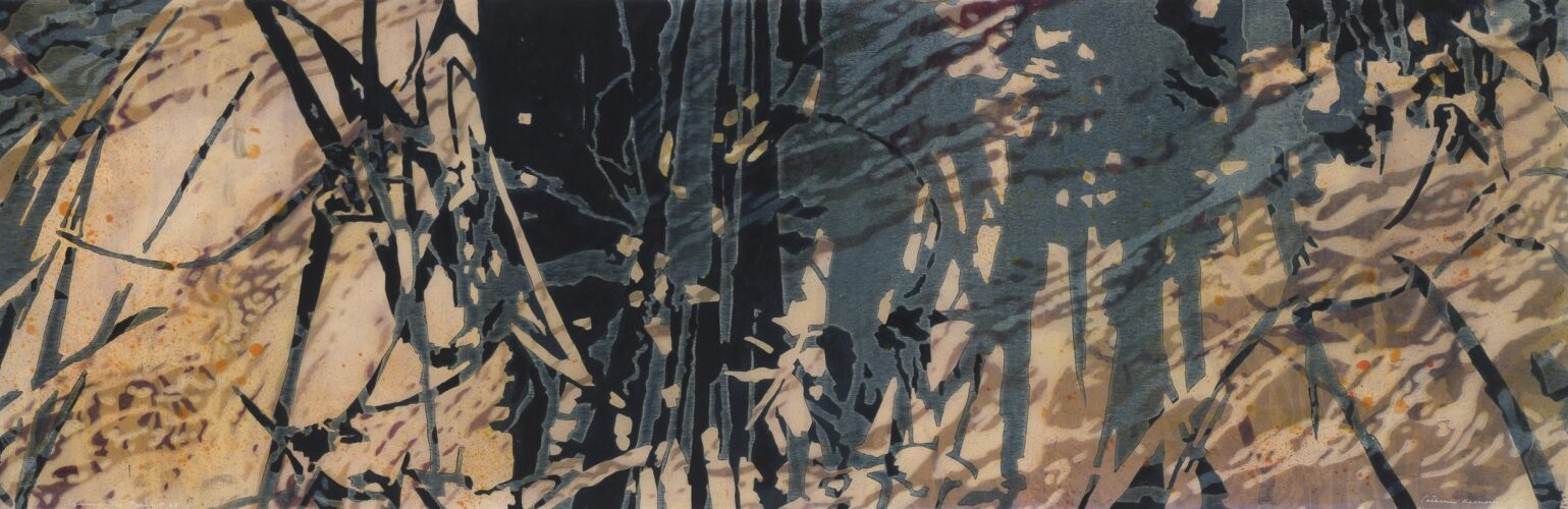A single gilded intaglio print with chine collé. This print was editioned from a laser engraved cast acrylic plate, inked with transparent base, and then printed onto starlight-exposed cyanotyped Okuwara collé on Hahnemühle Copperplate. The image was then revealed with 24 karat gold leaf.