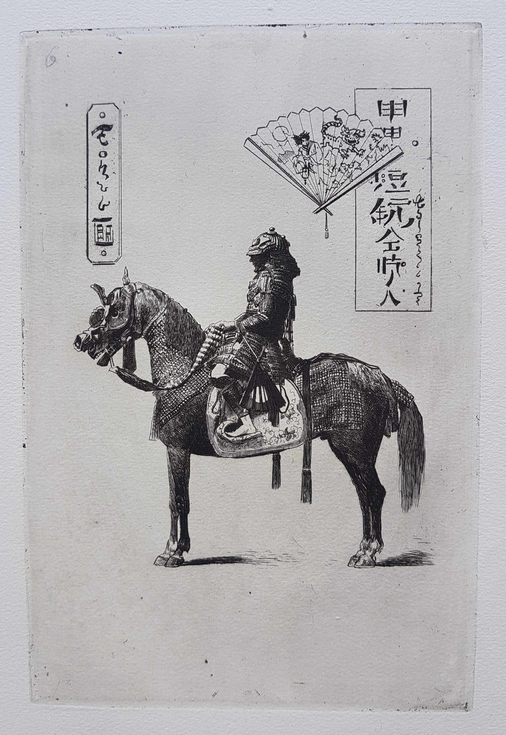 The Japonisme plates are not the only ones that testify to Buhot’s interest in Japan. Le Poisson volant (Flying fish, B/G 52), Le Cabinet de lecture au Japon (Japanese reading room, B/G 53), La Marche Japonaise (Japanese march, B/G 84) for example, represent Japanese people. But the influence of Japanese art on Buhot does not only appear in the prints representing objects or customs. Phillip Dennis Cate notes the way he plays with Japanese codes, for example in the plate Cavalier Bronze (Bronze horse rider) where he “creates the effect of a Japanese print by superimposing a fan design and rectangular cartouches with Japanese characters describing the object.” He also suggests that the presence of cartouches and vignettes in Japanese art must have interested Buhot and reinforced his taste for remarques and symphonic margins in his own engravings. On the contrary, in Crapaud Bronze (Bronze Toad), engraved in 1883, the small inkwell appears less as an object than as an animal, against an atmospheric black background that is typical of Buhot’s landscapes. We can even see the moon shining in the night sky above the upside down toad. In this case, as Ph. D. Cate notes, “its Oriental identity is all but lost”.