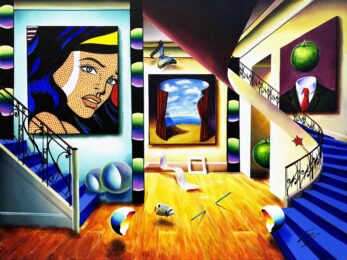Ferjo (Brazilian, born 1946) was born Fernando de Jesus Oliveira in Bahia, Brazil. Inspired by classical and contemporary art, Ferjo has developed a worldwide reputation for his dynamic, dreamlike compositions. As an artist, Ferjo has explored subjects ranging from realism to surrealism, and his artwork frequently alludes to legendary artists like Leonardo Da Vinci, Pablo Picasso, Rene Magritte, and others. His popular Surrealist paintings of fantastical and intricate interior spaces often feature homages to his artistic inspirations hanging on the walls.