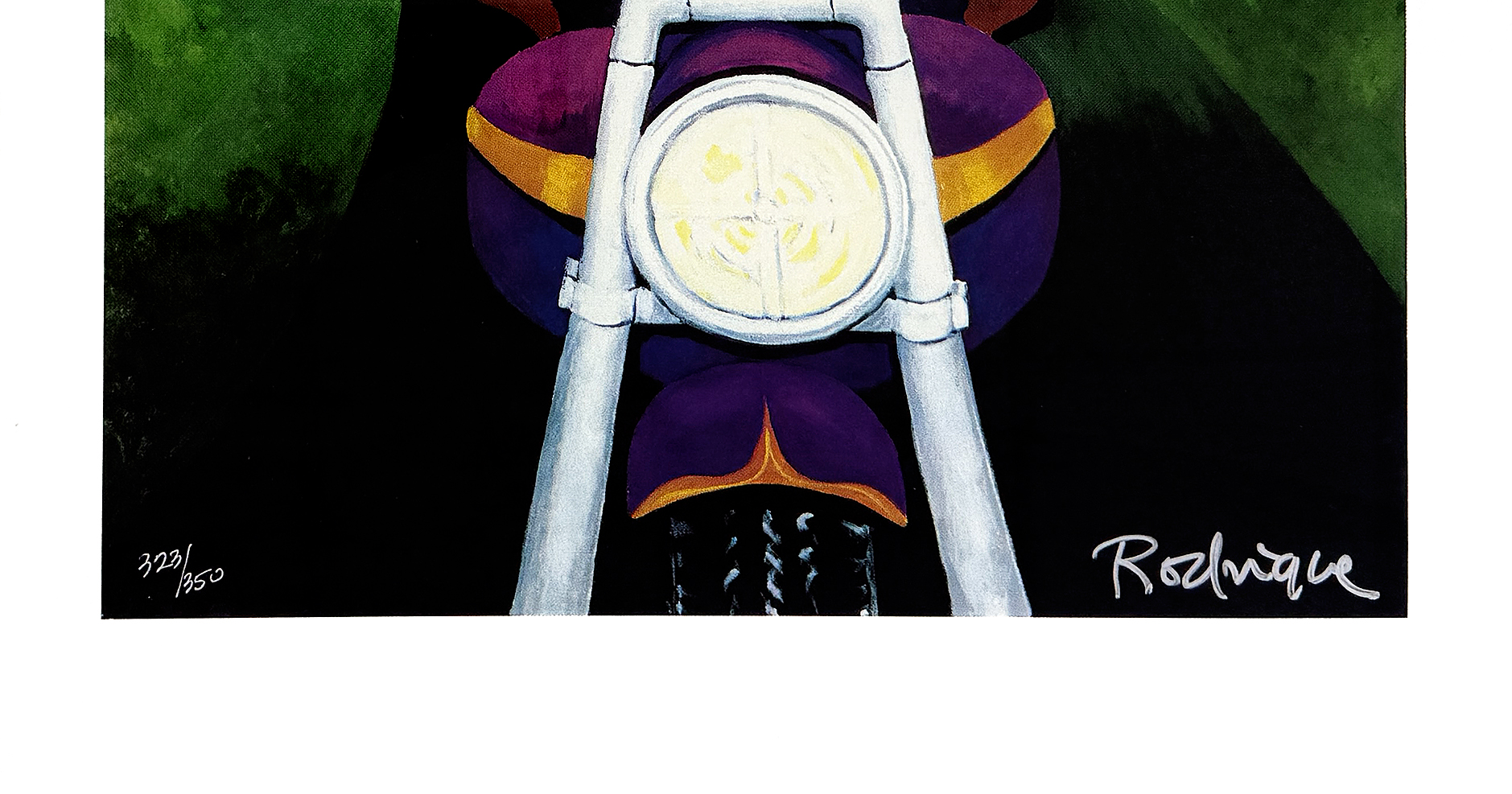 About the Artist: George Rodrigue (born March 13, 1944) is a Cajun artist who grew up in New Iberia, Louisiana. Rodrigue began painting outdoor family gatherings framed by moss-clad oak trees in an area of French Louisiana known as Acadiana.