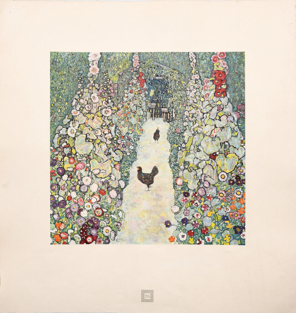 Edition of 500. One of 30 prints from the Eine Nachlese portfolio. Bauerngarten mit Hühnern was one of 16 original paintings by Klimt destroyed on 8 May 1945. The paintings were in storage in the Schloss Immendorf, a 16th-century castle in Lower Austria, which was set on fire by a retreating tank division of the German army.