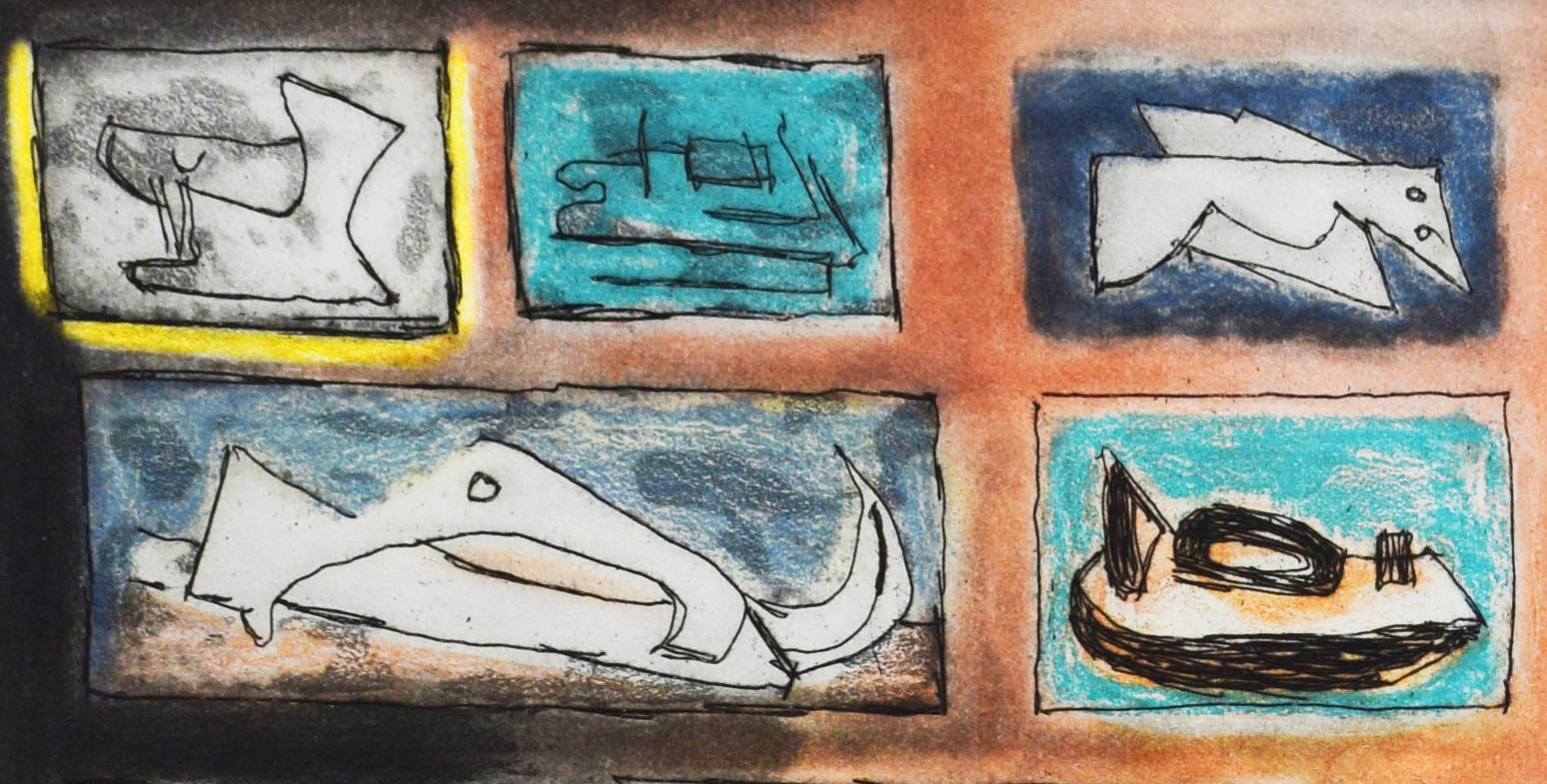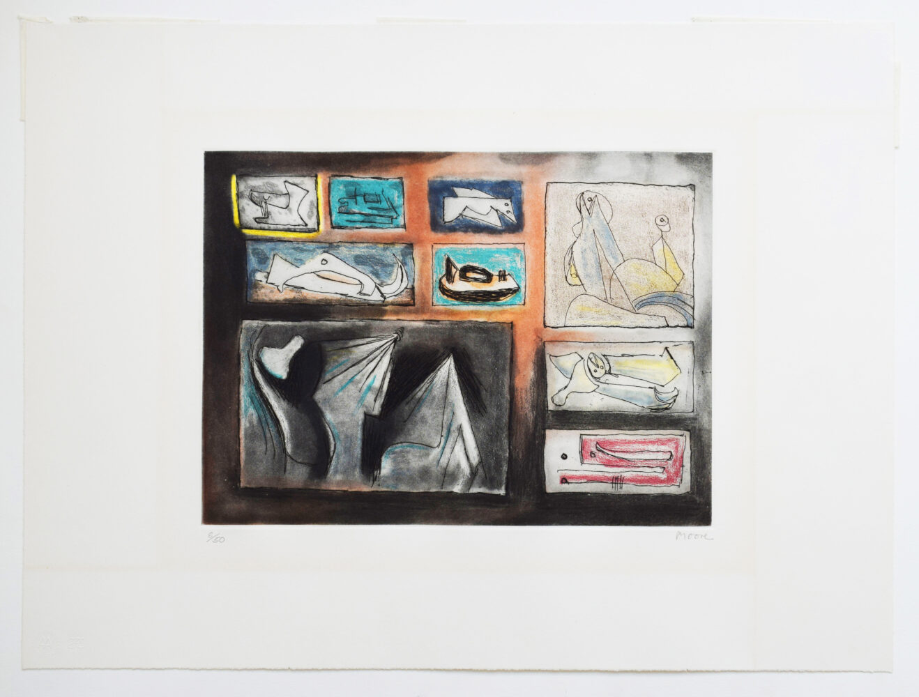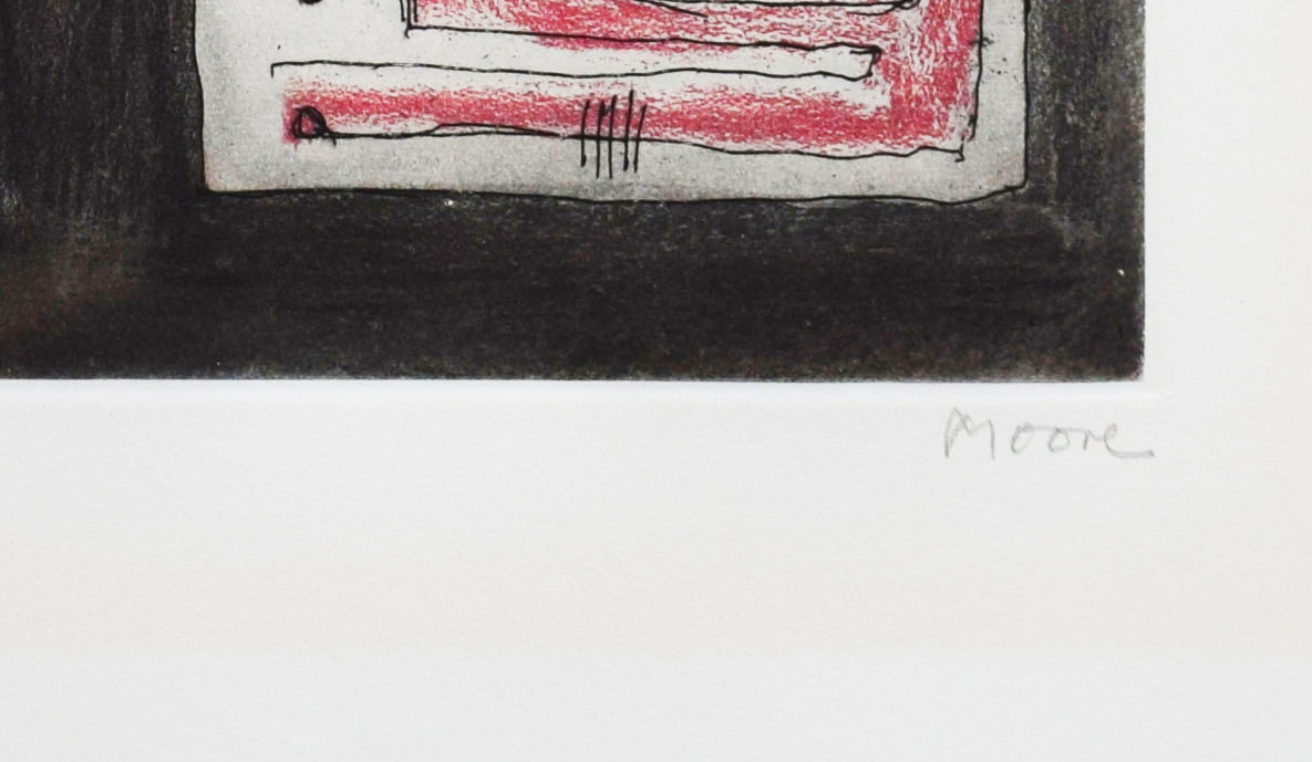 This original etching and aquatint is hand signed by the artist in pencil “Moore” at the lower right margin.