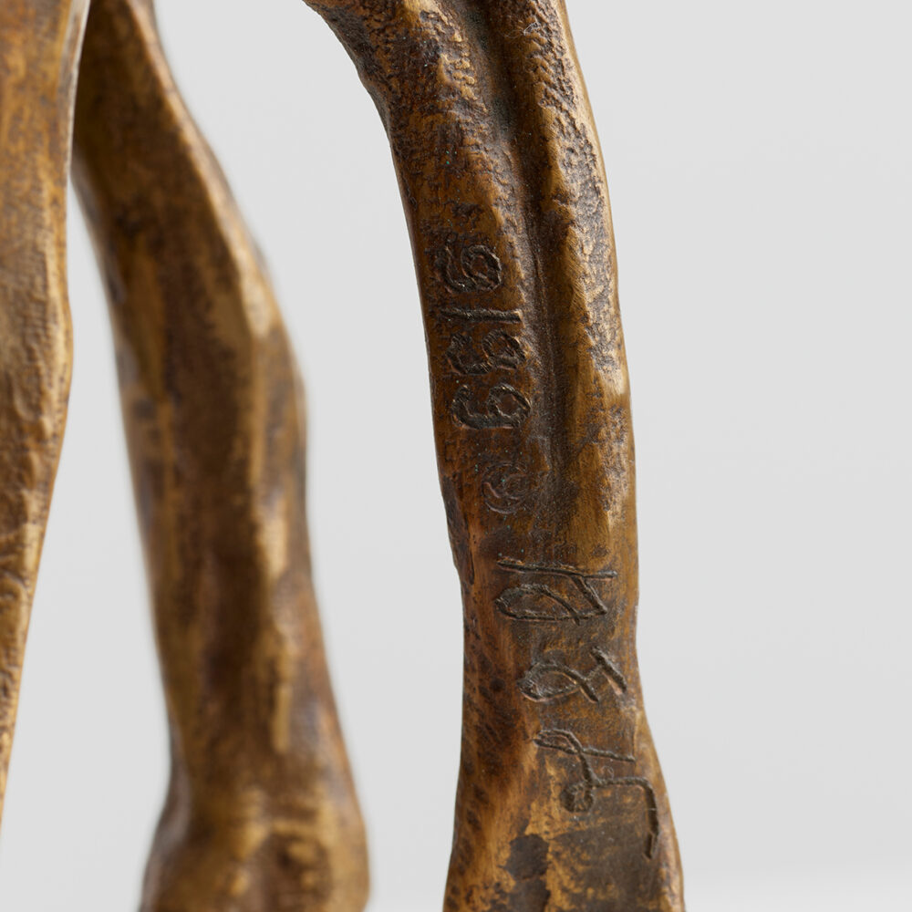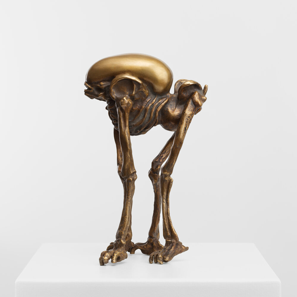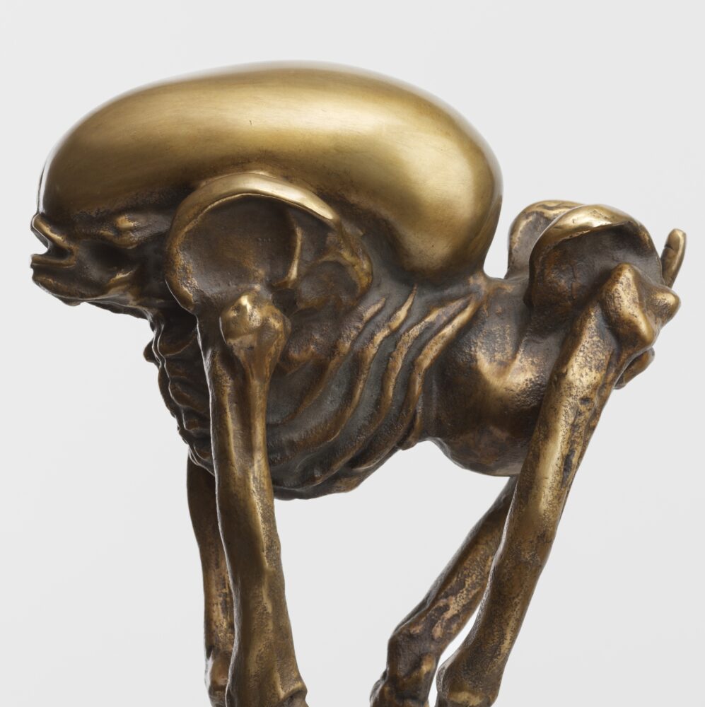 The carefully worked bronze surface moves between soft, polished highlights and deeper, patinated shadows that draw out every vertebra, tendon, and clawed foot. As one circles the piece, the figure shifts from animal to skeletal relic to embryonic alien, embodying the constant tension between the organic and the engineered that defines Giger’s practice.