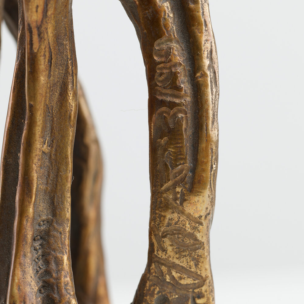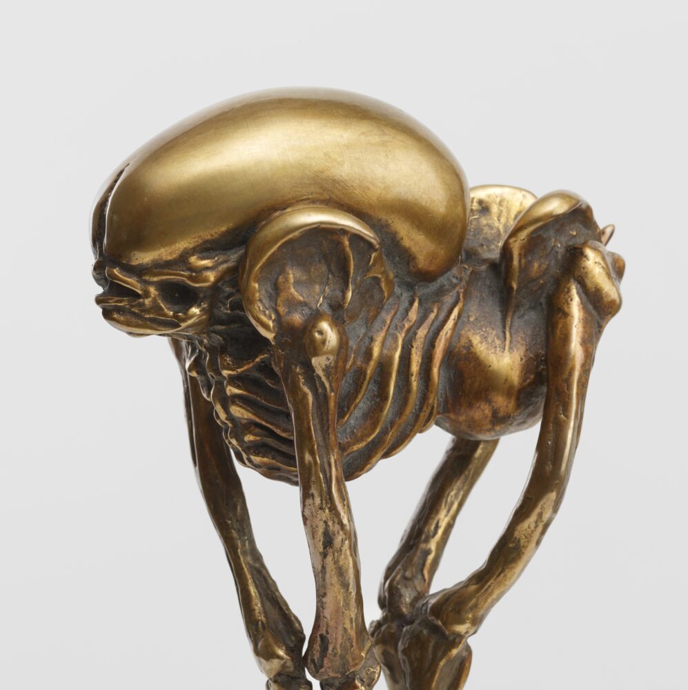 The carefully worked bronze surface moves between soft, polished highlights and deeper, patinated shadows that draw out every vertebra, tendon, and clawed foot. As one circles the piece, the figure shifts from animal to skeletal relic to embryonic alien, embodying the constant tension between the organic and the engineered that defines Giger’s practice.