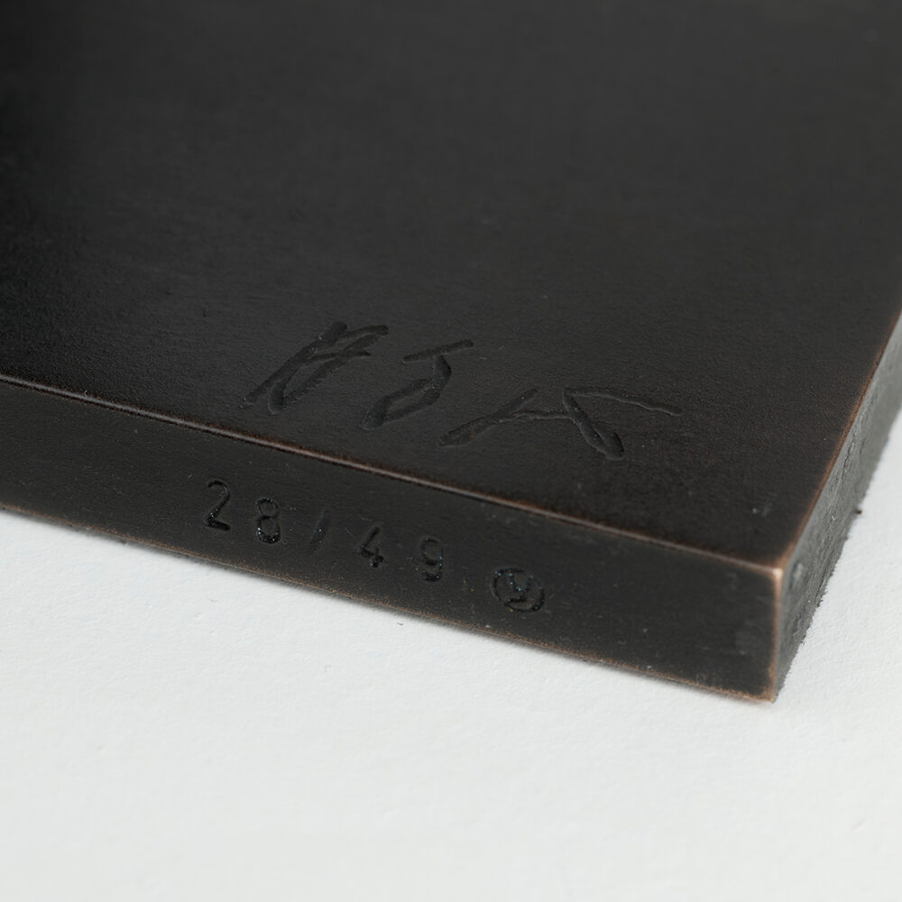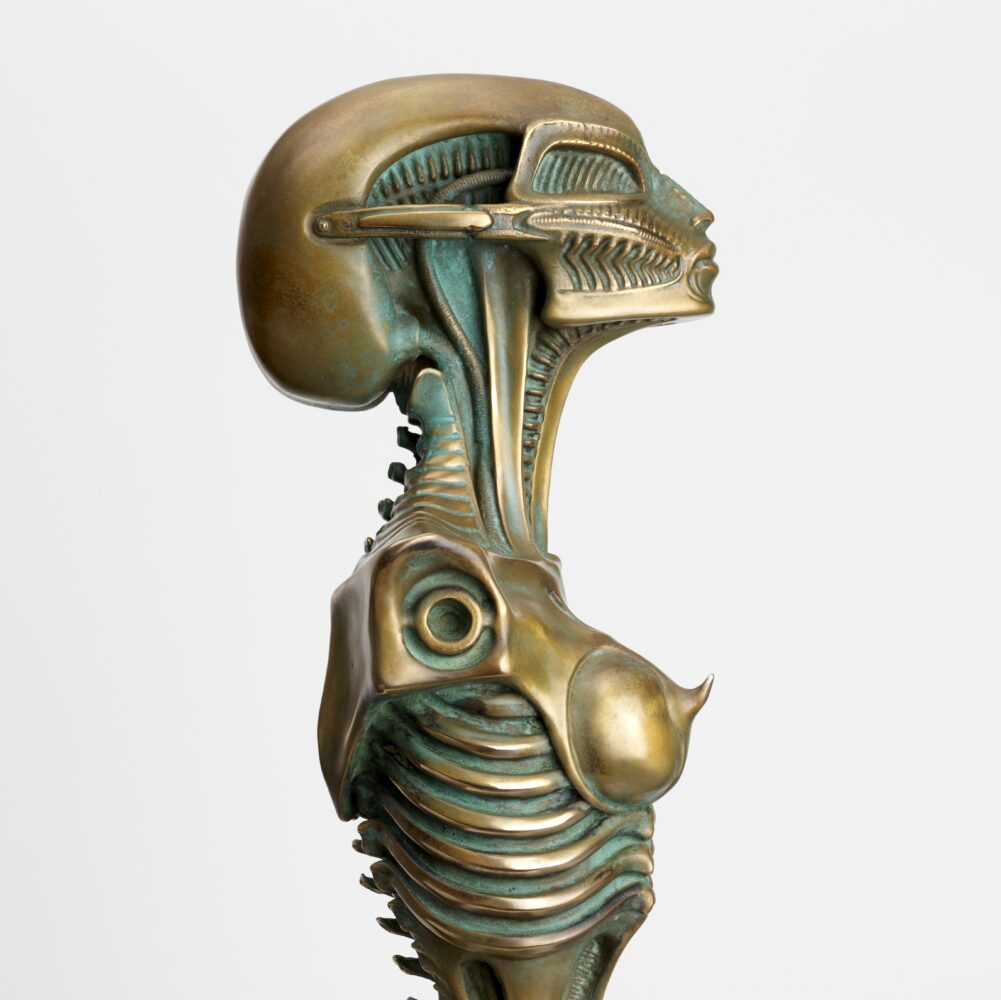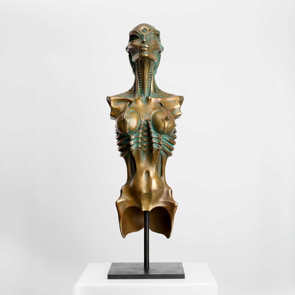 Conceived in 2002, Biomechanoid distills HR Giger’s unmistakable universe into a totemic bronze figure. Half-human, half-machine, this frontal torso fuses a sensual female anatomy with exoskeletal ribs, spinal plates, and cranial implants, epitomizing the “biomechanical” language that made Giger a cult figure in both cinema and contemporary art.