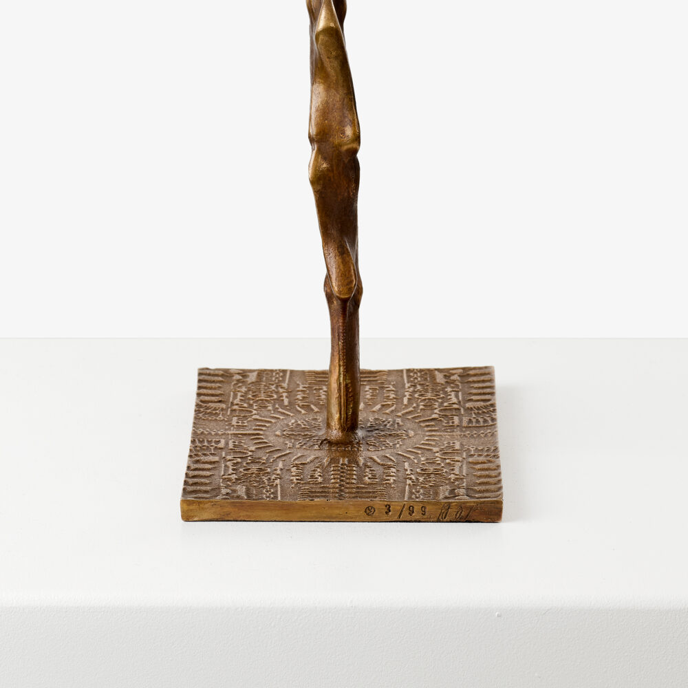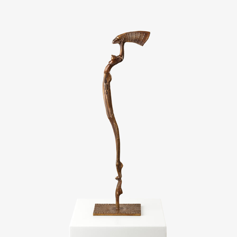 The figure, with its elongated legs and pharaoh-like presence, stands on a hieroglyphic plinth, evoking ancient Egyptian mysticism. Giger, captivated by mummies during his childhood visits to the Rätisches Museum, was particularly drawn to the Egyptian princess’s burial, a mix of fascination and dread that would later influence his art. The sculpture embodies this haunting yet mesmerizing connection to the past, showcasing Giger’s unique ability to merge the organic with the otherworldly.