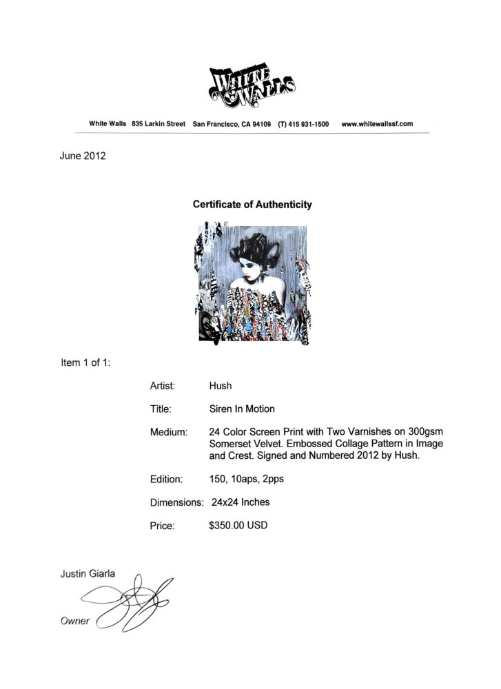 About the Artist: HUSH is a British mixed-media artist who fuses the aesthetic of street art with subjects from Japanese iconography like geishas and female manga characters. In his signature works, HUSH superimposes layers of vibrant wheatpaste patterns and graffiti onto delicate stencils of women’s faces. His unique approach to portraiture blends motifs from Eastern and Western art, resulting in abstracted works that appear both glamorous and seedy. HUSH studied graphic design at Newcastle University and worked as a toy designer in Japan, where he developed an appreciation for Japanese culture that continues to shape his work. HUSH’s art extends across a range of mediums, from outdoor murals to large- and small-scale paintings, screen prints, and, most recently, NFTs. His works have been exhibited in galleries across Europe, the United States, and Australia.