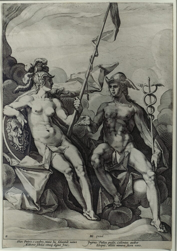 From a set of eight plates of mythological subjects and allegories after Hendrik Goltzius. A brilliant impression, trimmed on or just inside the platemark. Engraved with the brio that one of Goltzius’ main interpretors – also his stepson – brought to his designs.