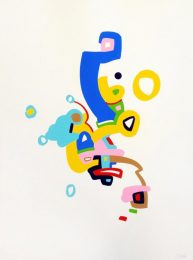 After two years of working as a technician for Hirst, Hunter has recently left to focus on his own work and career as an artist. He started to experiment with the butterflies and spots he’d been working on, however after realising this was a tedious and boring process that he wanted to move away from, he began to become frustrated with painting and the thought processes and self-questioning that comes with it. This led to a consideration of what the ‘opposite’ of this structured format he’d become accustomed to was. Realising that it was important to enjoy the journey in making the work, he began to empty his mind and try and not be aware of what was happening on the canvas. He would start at a certain point and then every subsequent mark he made was a response to what he saw, every mark becoming evident and meaningful. He then stops when he feels the time is right. The result is the honest and playful journey that forms the recent series of works seen here.