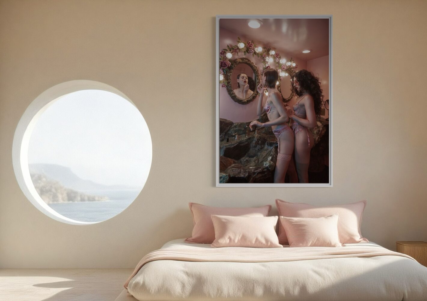 Arty-Fact: In Girls’ Night Inn, Jamie Nelson transforms a kitschy 1968 inn into a cheeky, seductive dreamscape where colour, intimacy, and female power intertwine. Through pastel excess and cinematic staging, two women move between play and performance—bathed in neon, wrapped in nostalgia, and seen through the liberating lens of the female gaze.