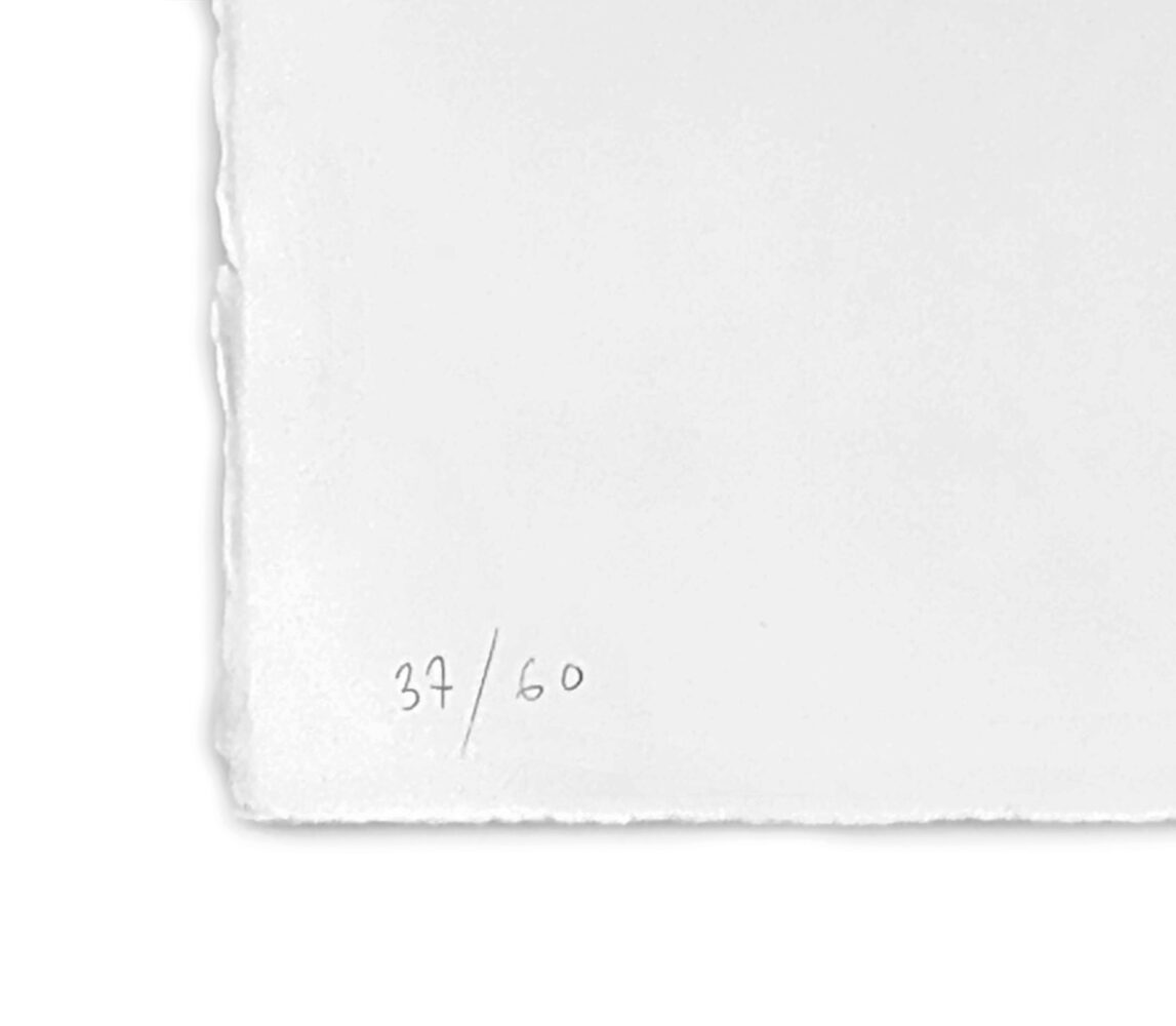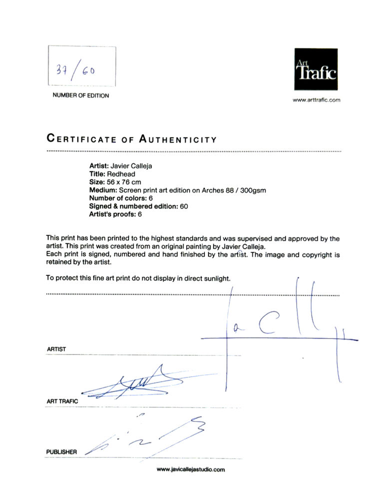 Hand finished color screen print on arches 88 300gsm paper. Hand signed lower right by Javier Calleja. Hand numbered 37/60 lower left. Sheet size: 29.92 x 22.04 inches. Frame size: 35 x 27.5 inches.