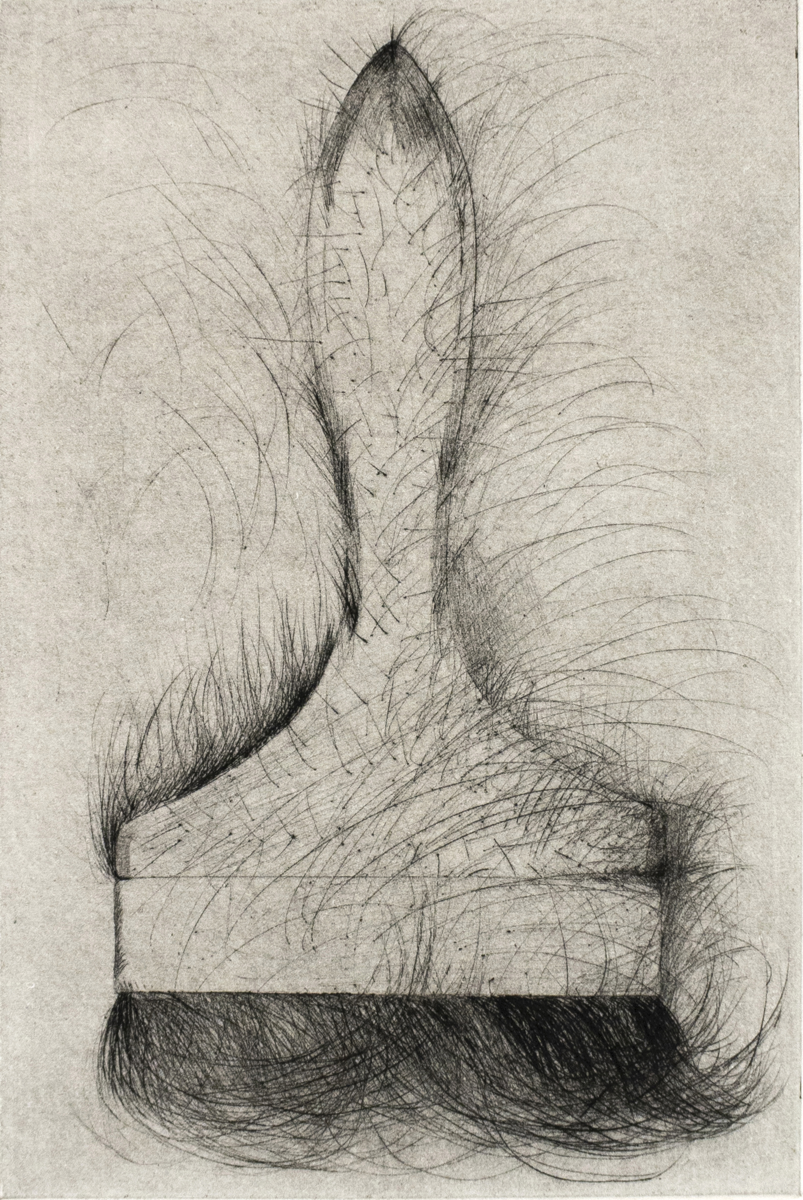 The hand tool is undoubtedly Jim Dine’s most iconic motif. Meticulously catalogued in rows like scientific specimens or sketched individually, hammers, awls, brushes, saws and screwdrivers assume a visceral symbolism. Curvilinear handles evoke the contours of limbs or bones, and even metal points and blades seem organic under Dine’s thoughtful hand. In this series of dry point prints, each tool is positioned vertically. Standing in for the artist’s body, the phallic shapes are gently shaded, appearing pressed into the soft grey background. Wisps of hair creep up and around each tool, as if the instruments themselves were sprouting from the body. Dine’s deft draftsmanship tempers the grotesque possibilities of this inanimate hirsutism, while the delicate, soft quality of dry point lines enhances the intimate nature of these portraits.