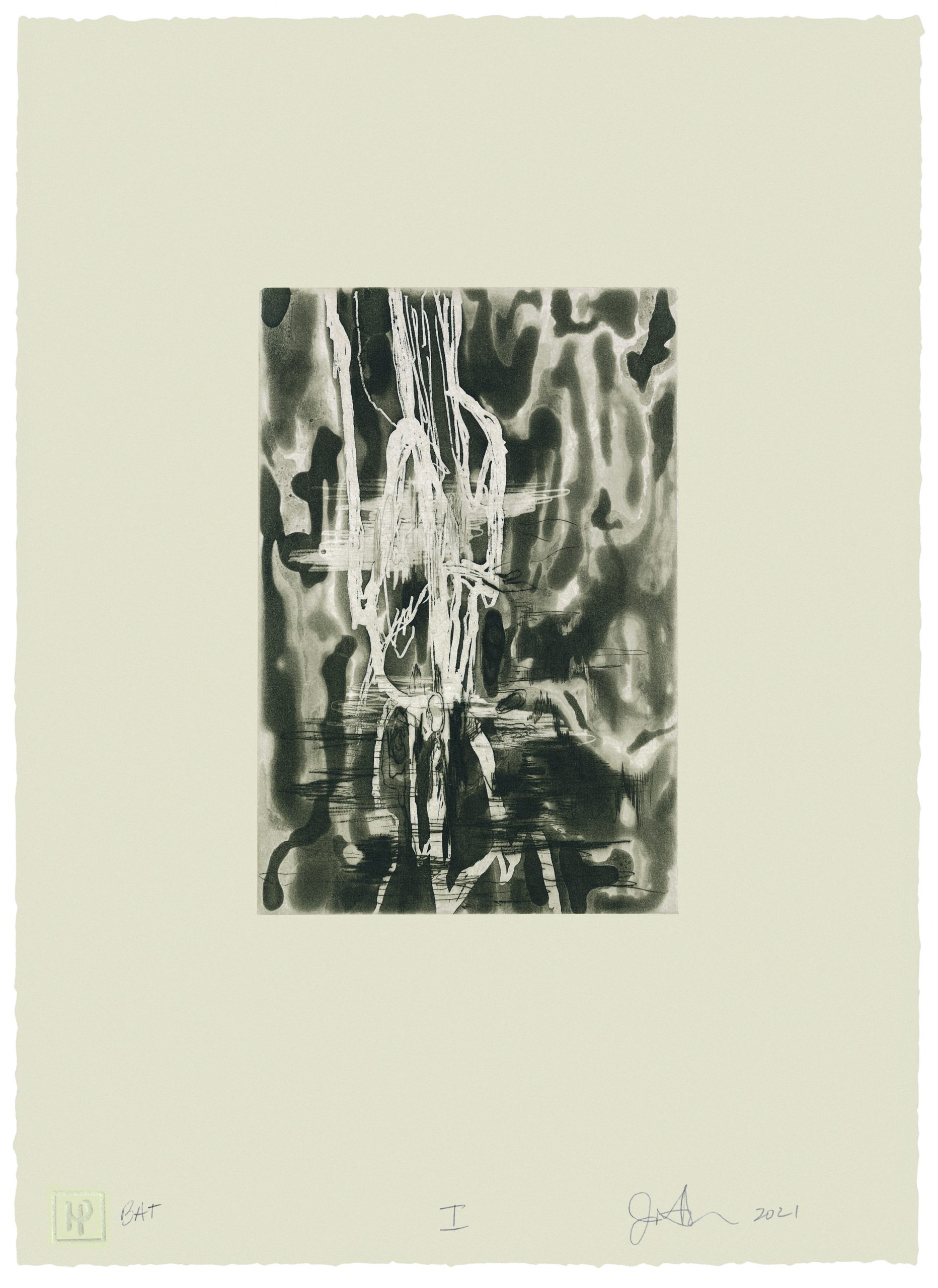Spit bite aquatint, drypoint, burnishing, chine collé