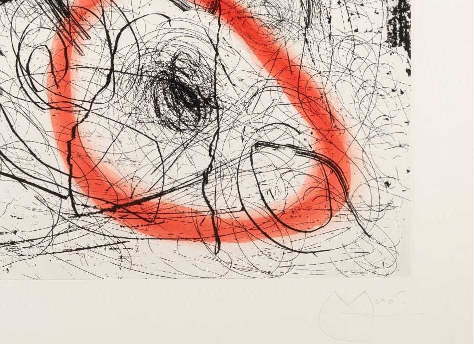 Miró interprets this legend not through narrative depiction, but through abstraction. Floating signs and gestural lines suggest the strands of hair transformed into celestial light, uniting earth and sky. The restrained palette and airy composition reflect a sense of movement and quiet radiance. Printed with exceptional care and hand-signed by the artist, Le chevelure de Bérénice I embodies Miró’s lyrical approach to myth and his mastery of translating poetic ideas into visual form.