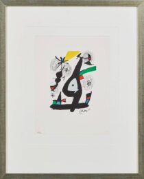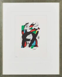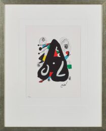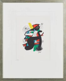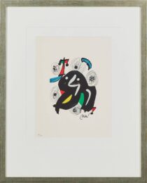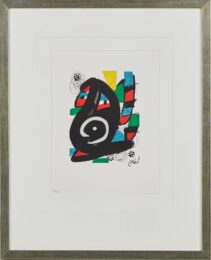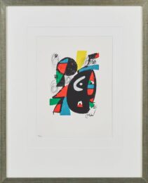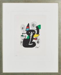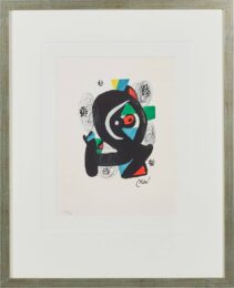 Joan Miró was a Spanish artist who was known for his abstract and surrealist artwork. He was active in the printmaking medium, creating lithographs, etchings, and linocuts. Miró’s prints often feature biomorphic shapes, bold colours and abstract patterns that are inspired by nature, and the subconscious mind.