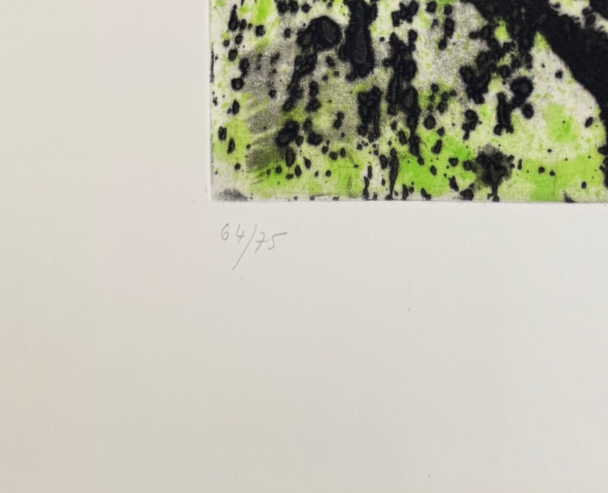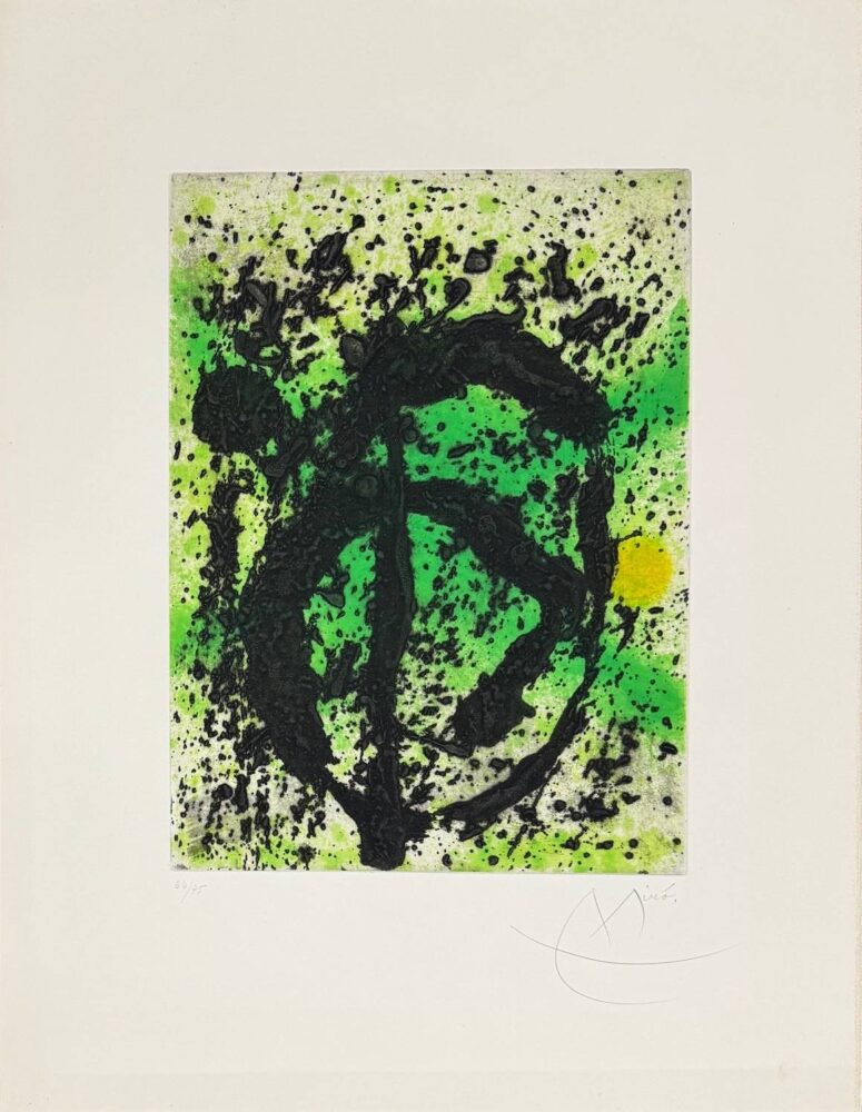 The aquatint with carborundum technique plays a central role in this effect. Carborundum allows for deep, granular textures and dense fields of colour, giving the work a tactile, almost earthy presence. These rich surfaces contrast with Miró’s sharp lines and floating shapes, creating an interplay reminiscent of seeds, stems, and organic structures emerging from fertile ground. The technique perfectly supports the theme: the carborundum textures become the soil in which Miró’s forms seem to grow.