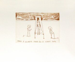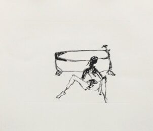 Light and shade reinforce and camouflage the form in this dramatic etching. It relates to the first drawings John Maine RA prepared for a sequence of stacked sandstone cylinders he sculpted in 1995.