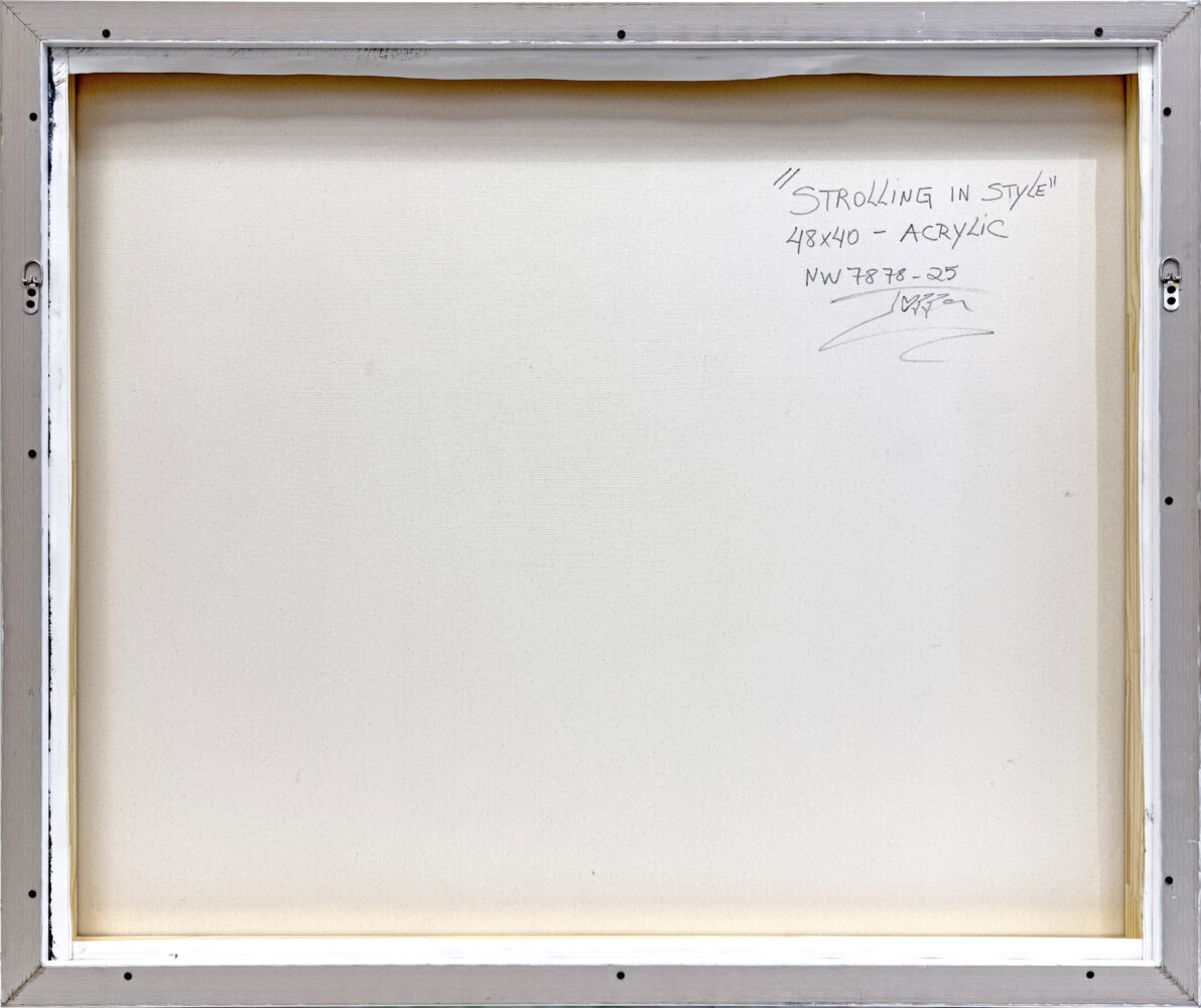 Original acrylic painting on canvas with diamond dust. Hand signed on front; signed and titled on verso by Jozza. Canvas size: 40 x 48 inches. Frame size: 41.62 x 49.62 x 2 (white floating frame hand painted by Jozza).