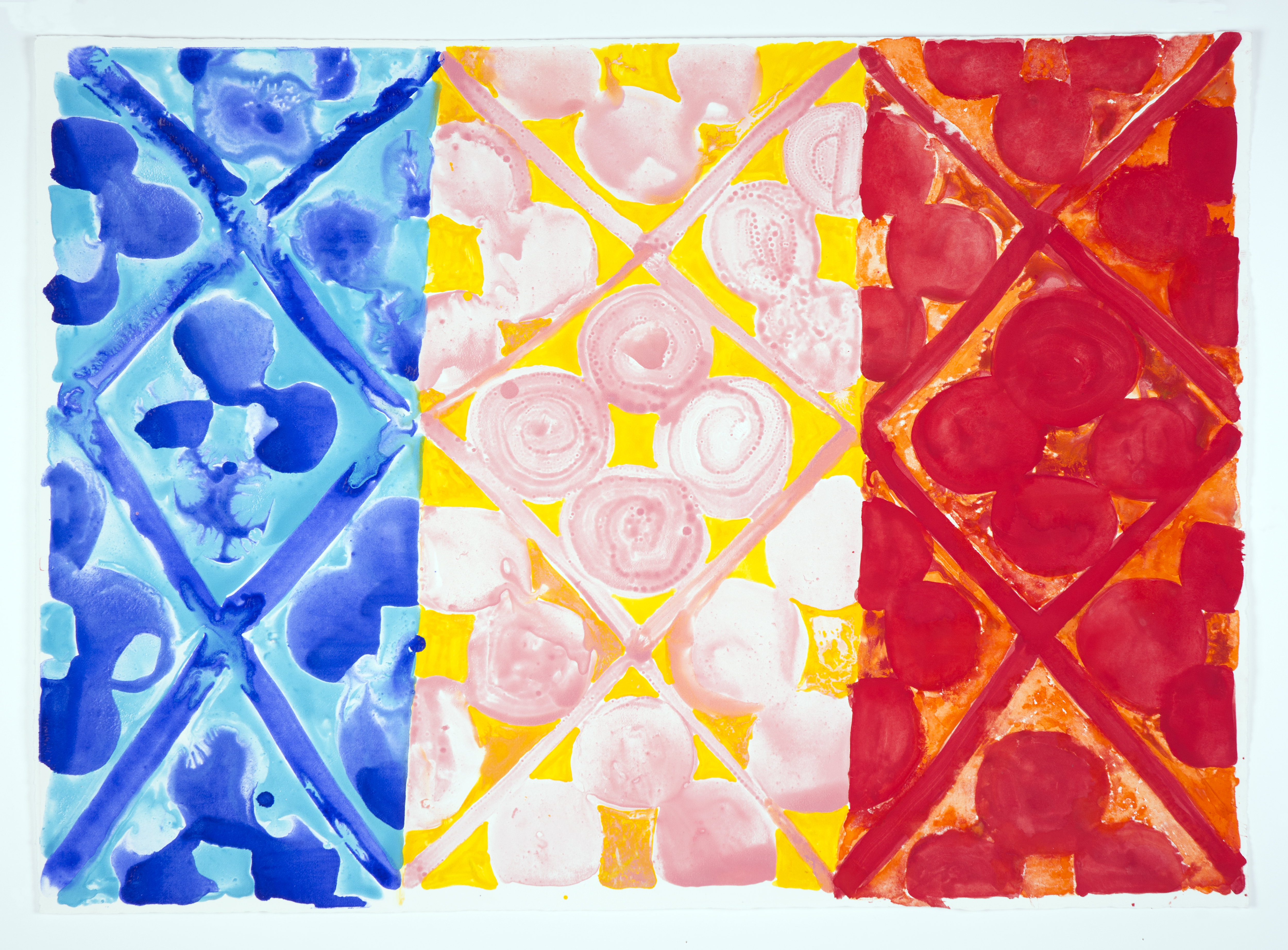 A colorful monotype made using watercolor, printed on Khadi paper.