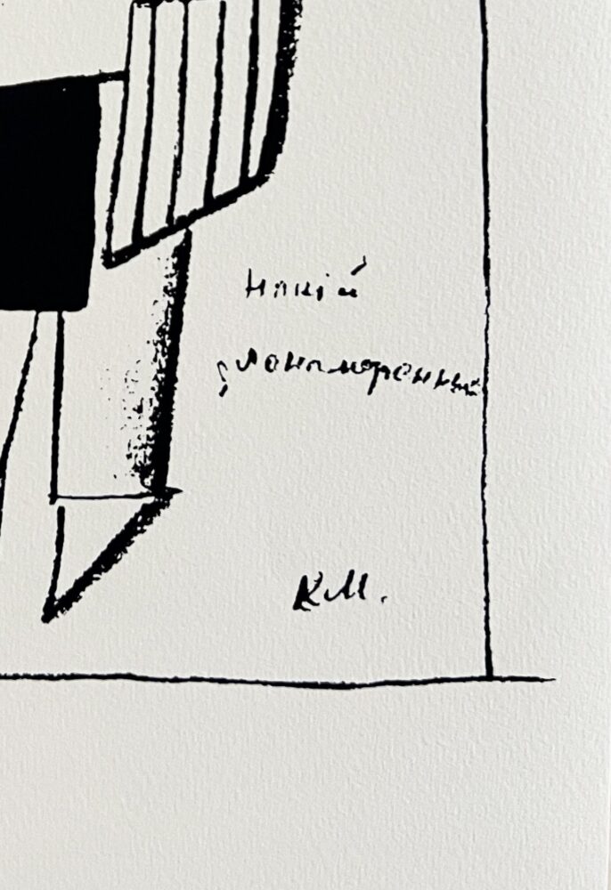 This silkscreen is based on Kazimir Malevich’s original stage designs from 1913 for the avant-garde opera Victory over the Sun (Sieg über die Sonne), a seminal collaboration between Russian Futurist figures Aleksei Kruchonykh (libretto), Mikhail Matyushin (music), and Malevich (sets and costumes). The opera marked a radical break from traditional aesthetics, embracing transrational language (Zaum), geometric abstraction, and a rejection of narrative logic.