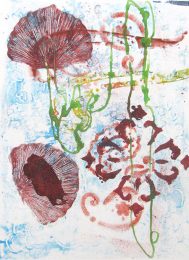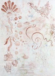 Evocative etching in aquatic tones referencing ancient manuscripts and artifacts that describe an almost secret world……“I am a chronicler of something important that has yet to be revealed….Notes from the Edge of the World, incorporate the imagery of rubber stamps, frequently of a botanical or decorative form.”
