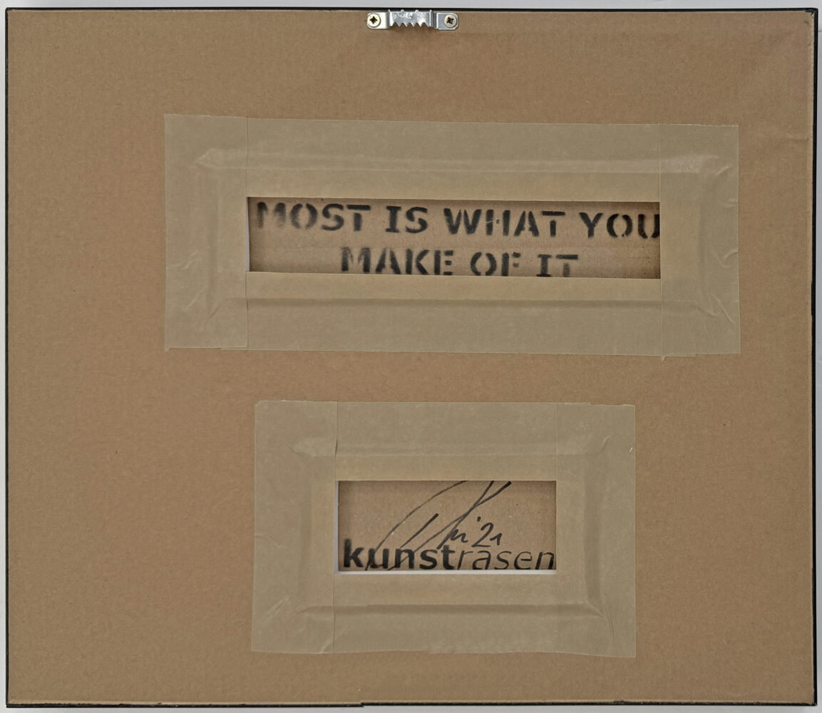 Original spray paint and stencil on cardboard. Hand signed and dated on verso by Kunstrasen. Artwork size 8.5 x 10.75 inches. Frame size 13 x 14.5 inches.