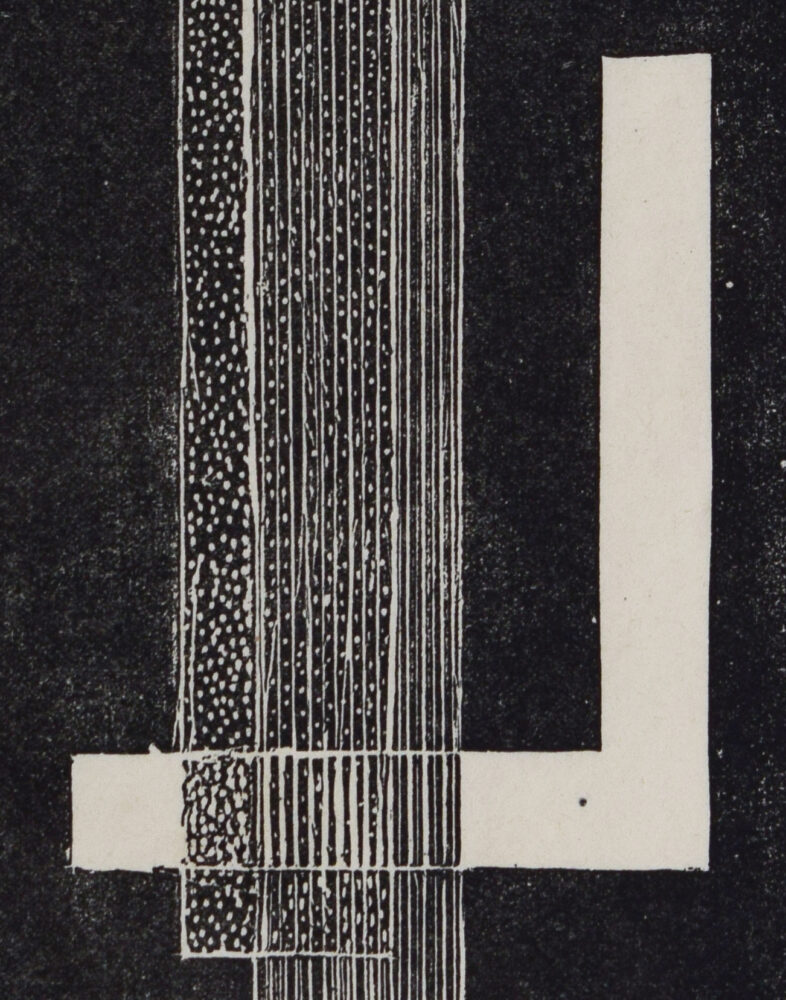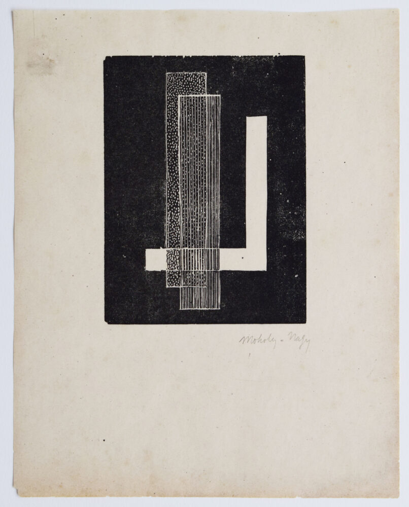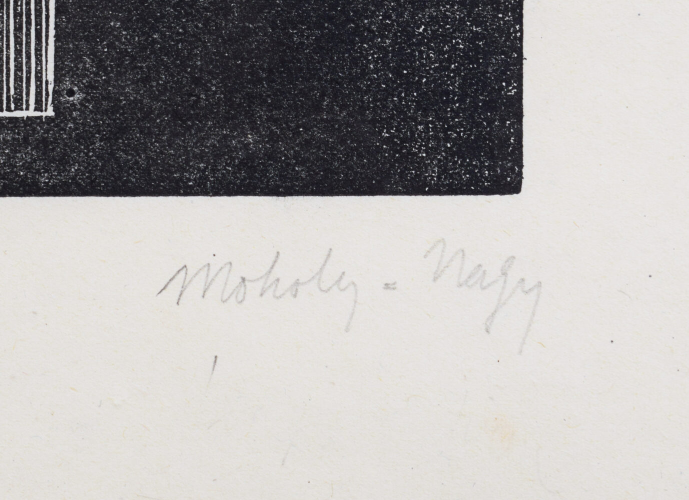 This linocut in black ink is hand signed in pencil by the artist ‘Moholy-Nagy’ in the lower right margin.