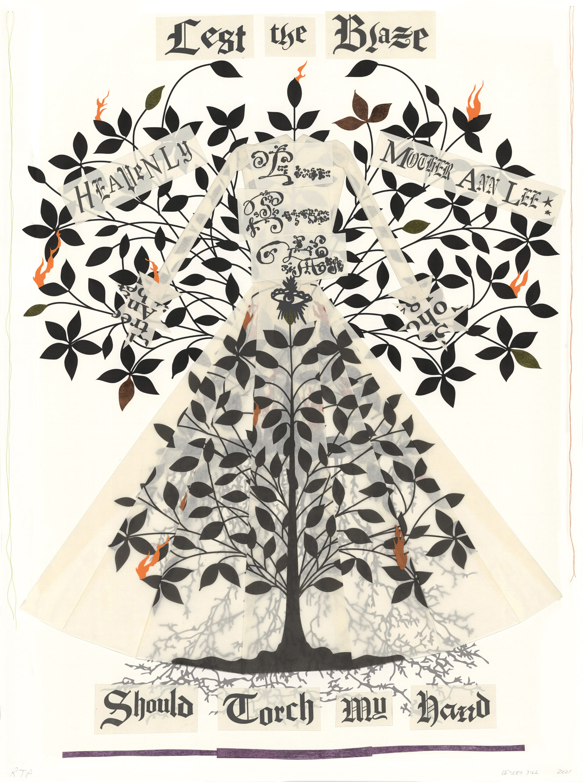 Screen print, relief, and collage with colored silver and gold leaf and thread on Sekishu Thick, Kozo, French Black Hemptone, and Rives BFK. Printed and published by Tandem Press.